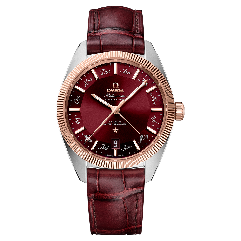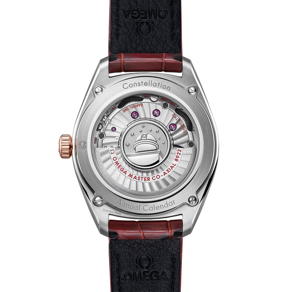 Enfin, cette montre dotée d'un bracelet en cuir bordeaux est entraînée par le calibre OMEGA Co-Axial Master Chronometer Calendrier Annuel 8922, doté d'une technologie antimagnétique révolutionnaire.