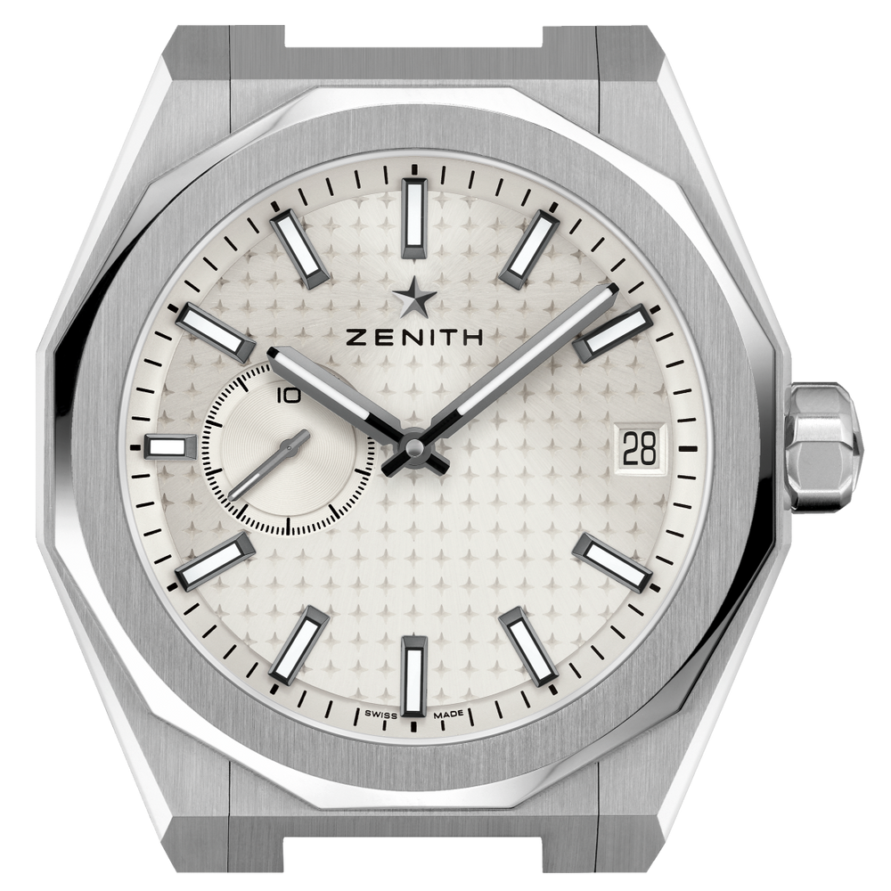 DEFY Skyline in a 41mm steel octagonal case with a faceted bezel, featuring a silver-toned sunburst-patterned dial revisiting the emblematic ZENITH four-pointed star. Powered by the El Primero 3620 high-frequency automatic manufacture movement with the very first 1/10th of a second indicator. Delivered with a steel bracelet, a second khaki green patterned rubber strap is included, to fully experience the interchangeability.