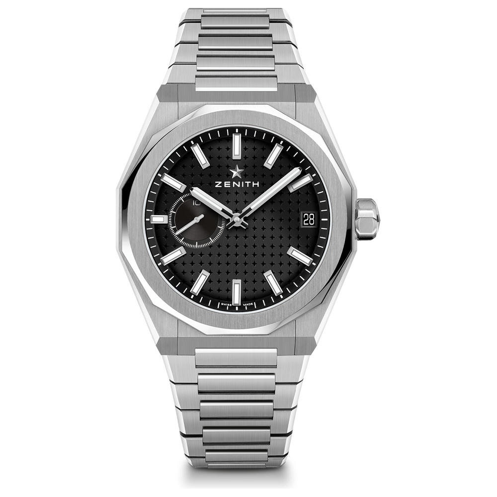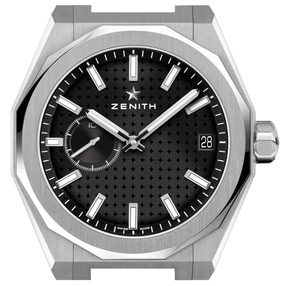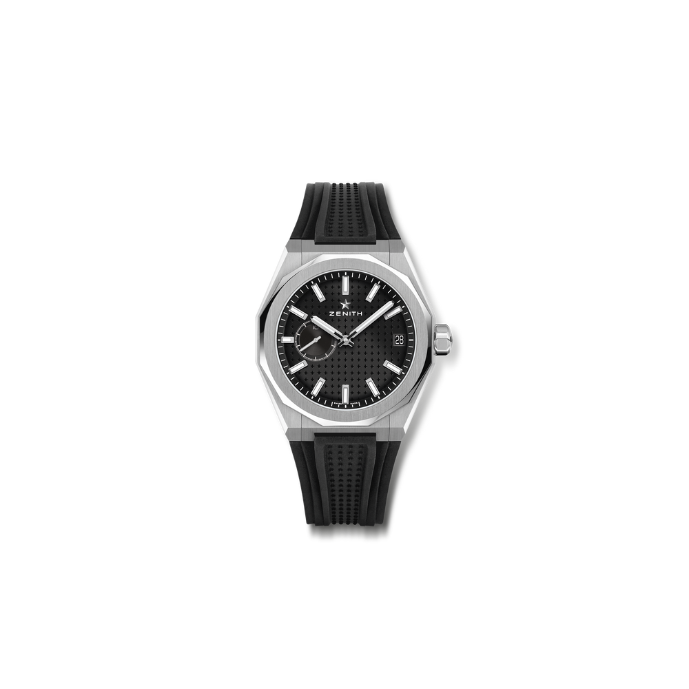 DEFY Skyline in a 41mm steel octagonal case with a faceted bezel, featuring a black-toned matte-patterned dial revisiting the emblematic ZENITH four-pointed star. Powered by the El Primero 3620 high-frequency automatic manufacture movement with the very first 1/10th of a second indicator. Delivered with a steel bracelet, a second black patterned rubber strap is included, to fully experience the interchangeability.