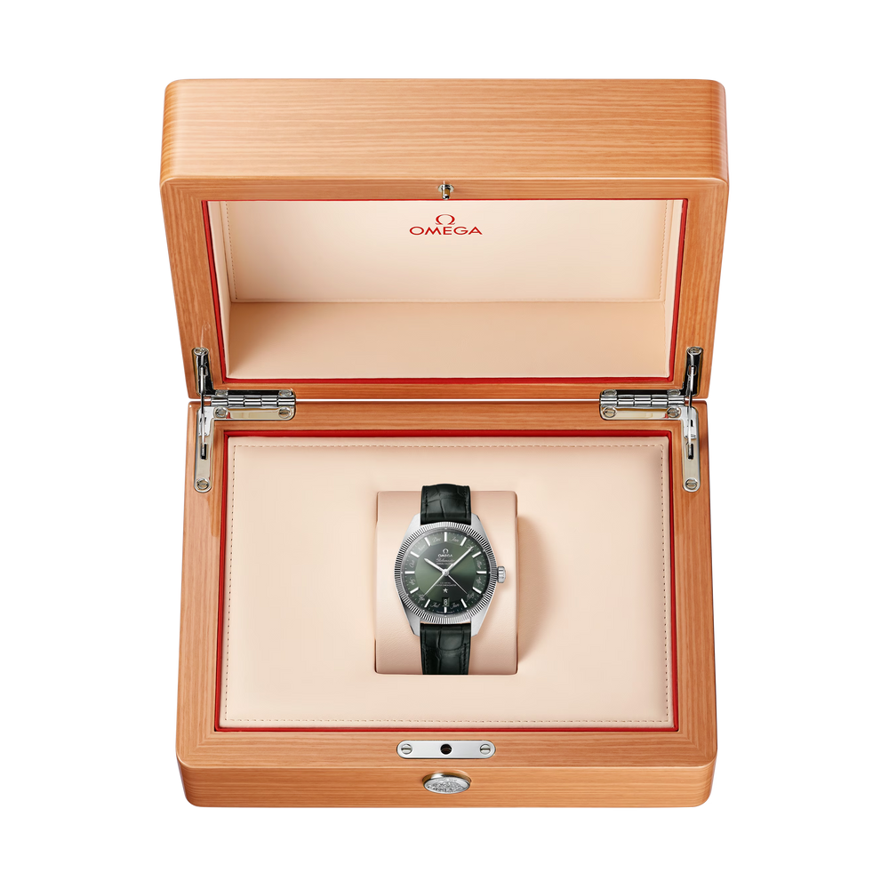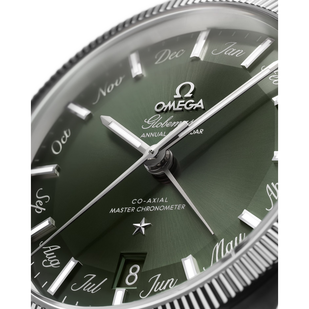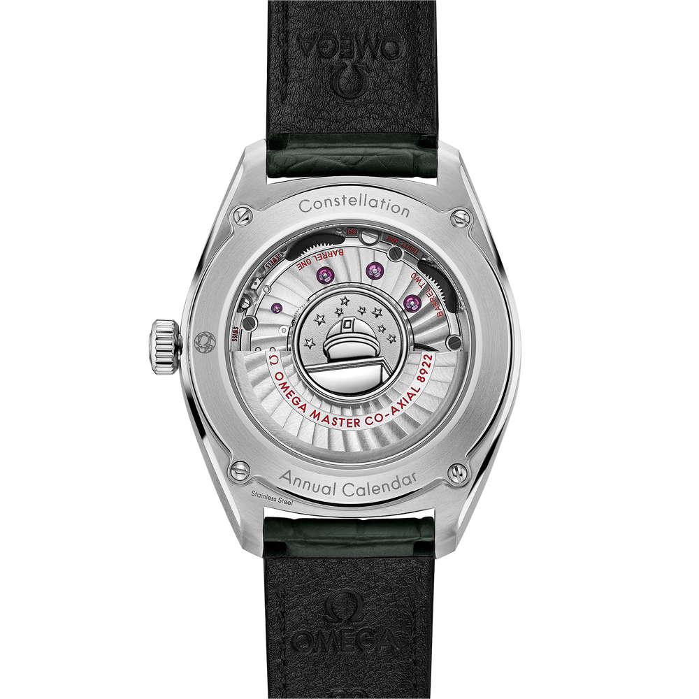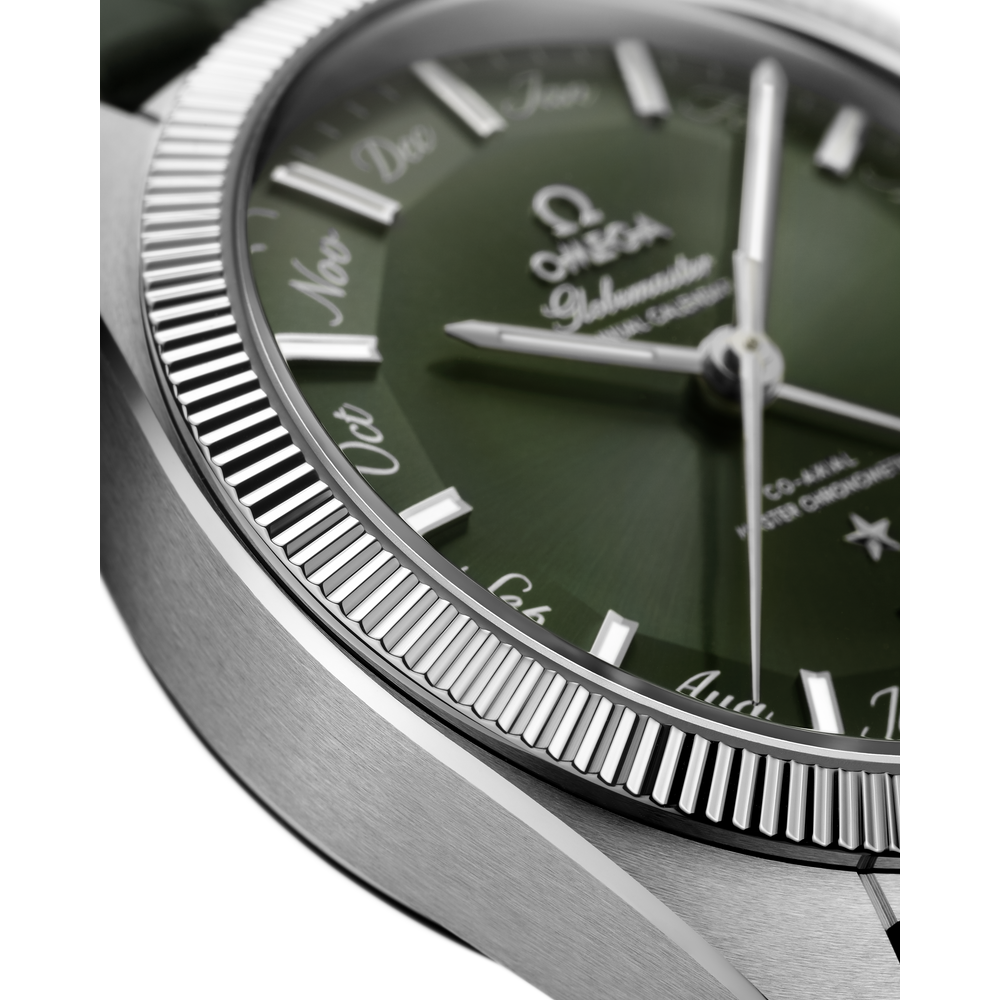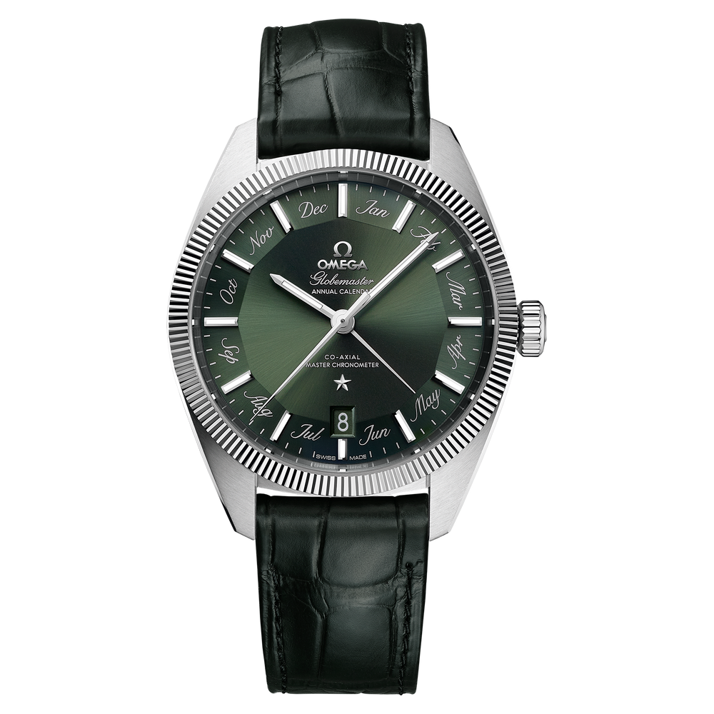 This watch has a green leather strap and is driven by OMEGA's Co-Axial Master Chronometer Annual Calendar Calibre 8922, featuring revolutionary anti-magnetic technology.