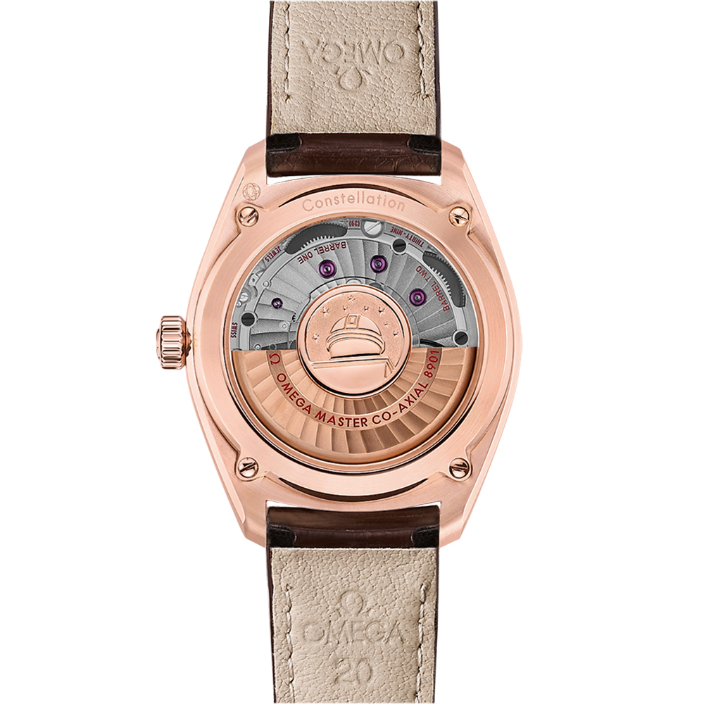Sedna™ gold is again used on the Constellation star, and hands and indexes which have also been filled with illuminous Super-LumiNova. To add more sophistication, the watch features a brown leather strap, and an 18K Sedna™ gold central Observatory medallion set in sapphire crystal on the caseback.