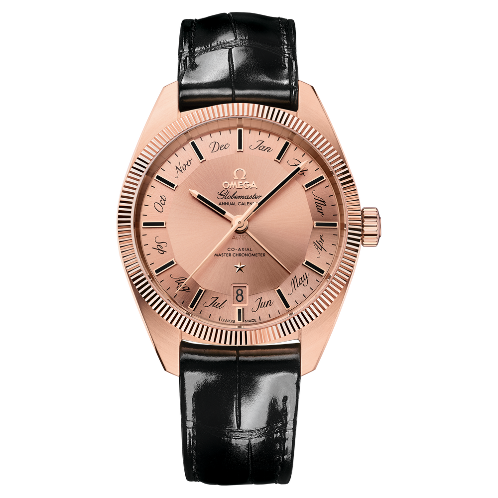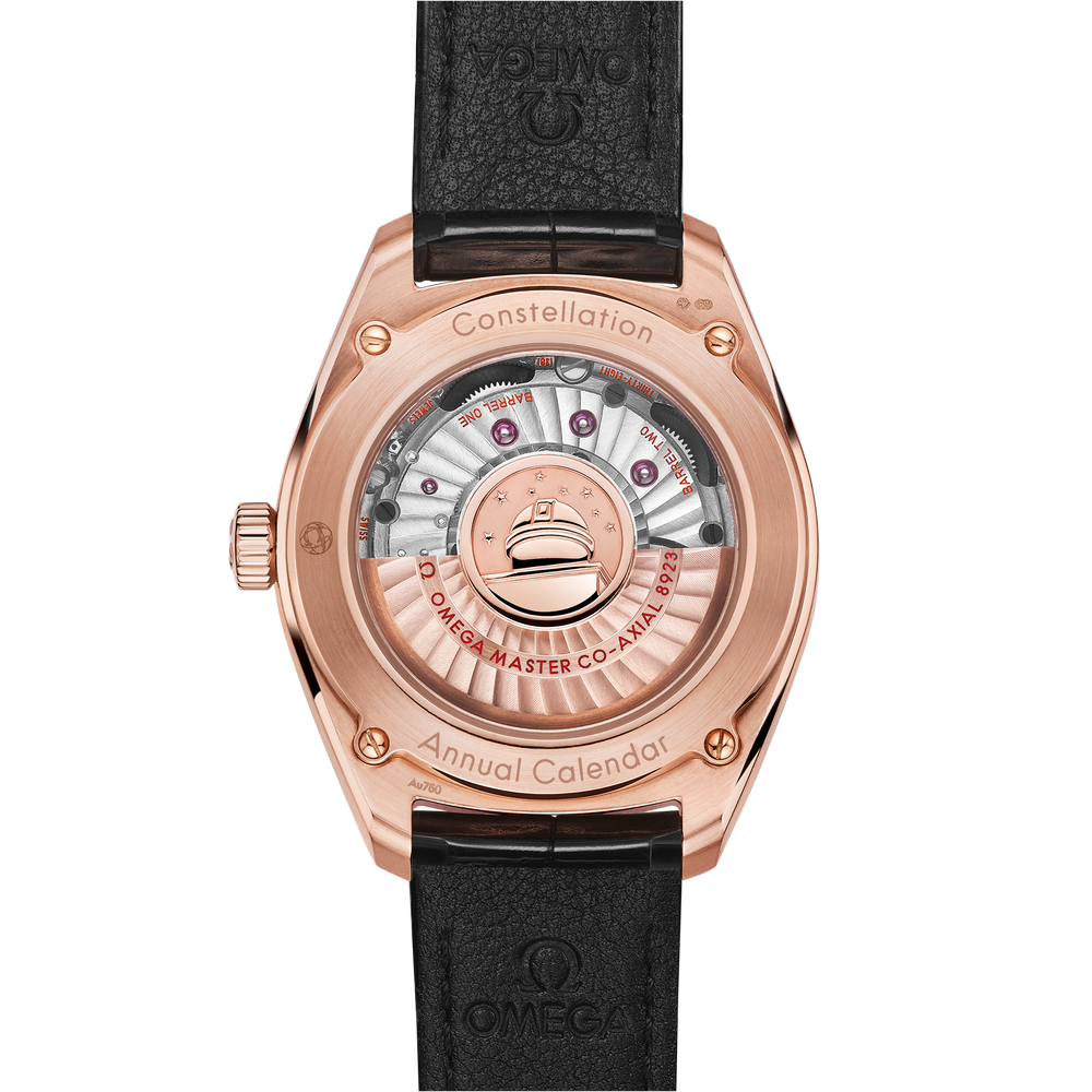 This watch has a glossy black leather strap and is driven by OMEGA's Co-Axial Master Chronometer Annual Calendar Calibre 8923, featuring revolutionary anti-magnetic technology.