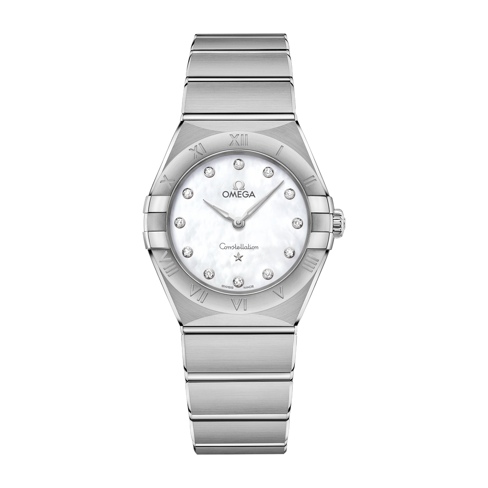 The dramatic and enduring design of the OMEGA Constellation is characterised by its famous half-moons, “claws” on the case and mono-rang bracelet.This 28 mm stainless steel model features a bezel engraved with Roman numerals, white mother-of-pearl dial with diamond hour markers and scratch-resistant sapphire crystal. The hands, OMEGA logo, Constellation star and diamond holders are in 18K white gold.At the heart of this timepiece is the OMEGA Calibre 4061, while the caseback is stamped with the Constellation Observatory medallion.