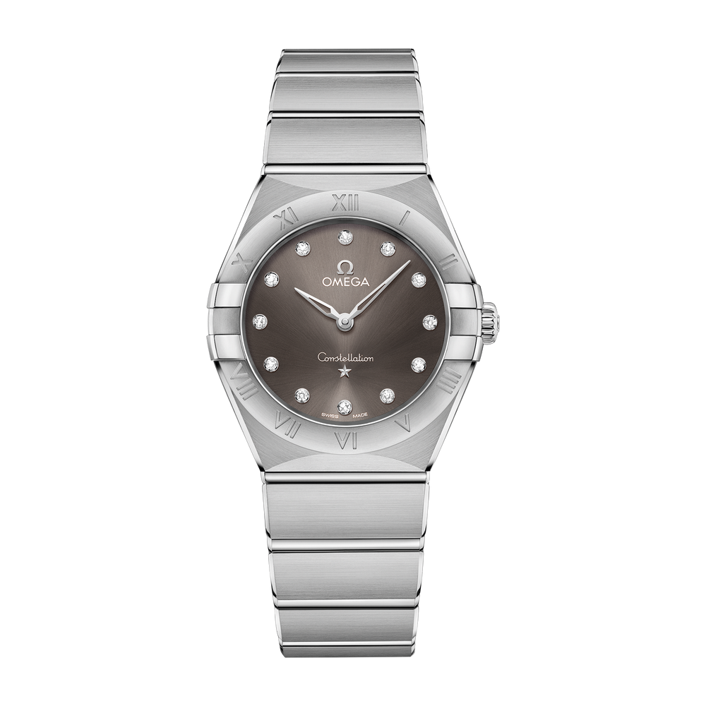 The dramatic and enduring design of the OMEGA Constellation is characterised by its famous half-moons, “claws” on the case and mono-rang bracelet.This 28 mm stainless steel model features a bezel engraved with Roman numerals, sun-brushed grey dial with diamond hour markers and scratch-resistant saphire crystal. The hands, OMEGA logo, Constellation star and diamond holders are in 18K white gold.At the heart of this timepiece is the OMEGA Calibre 4061, while the caseback is stamped with the Constellation Observatory medallion.