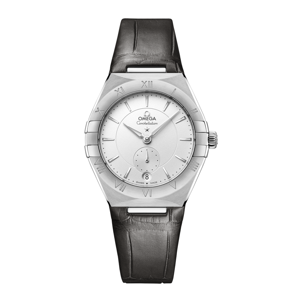 This 34 mm model in stainless steel features a bezel with engraved Roman Numerals, a crystal white silvery dial, and a round date window at the 6 o'clock position. The polished hour markers, hands, OMEGA logo and Constellation star are all in 18K white gold, while the Small Seconds subdial and Central Minute Track are circled by rings.