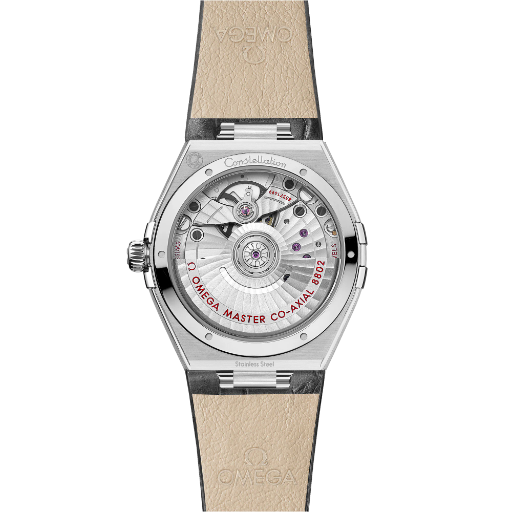 Presented on a grey leather strap, the timepiece is driven by the OMEGA Co-Axial Master Chronometer Calibre 8802, visible through the domed scratch-resistant sapphire crystal.