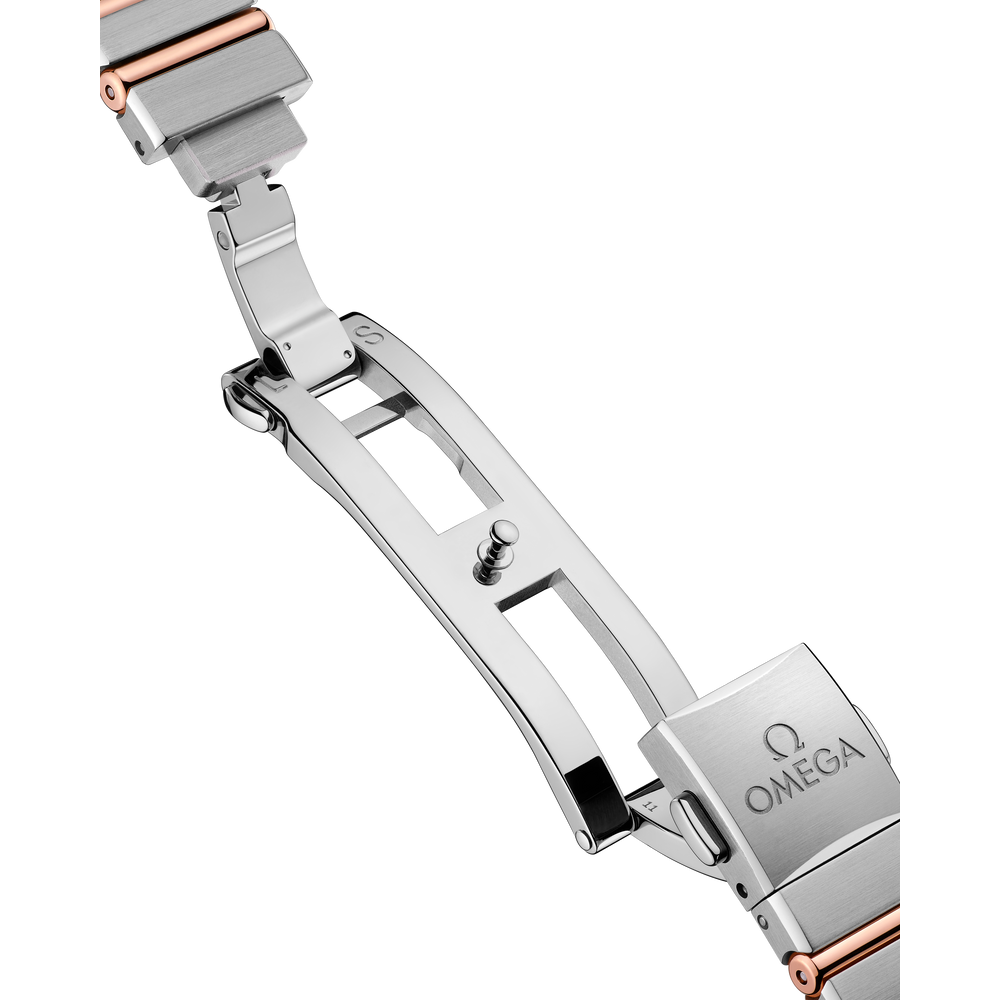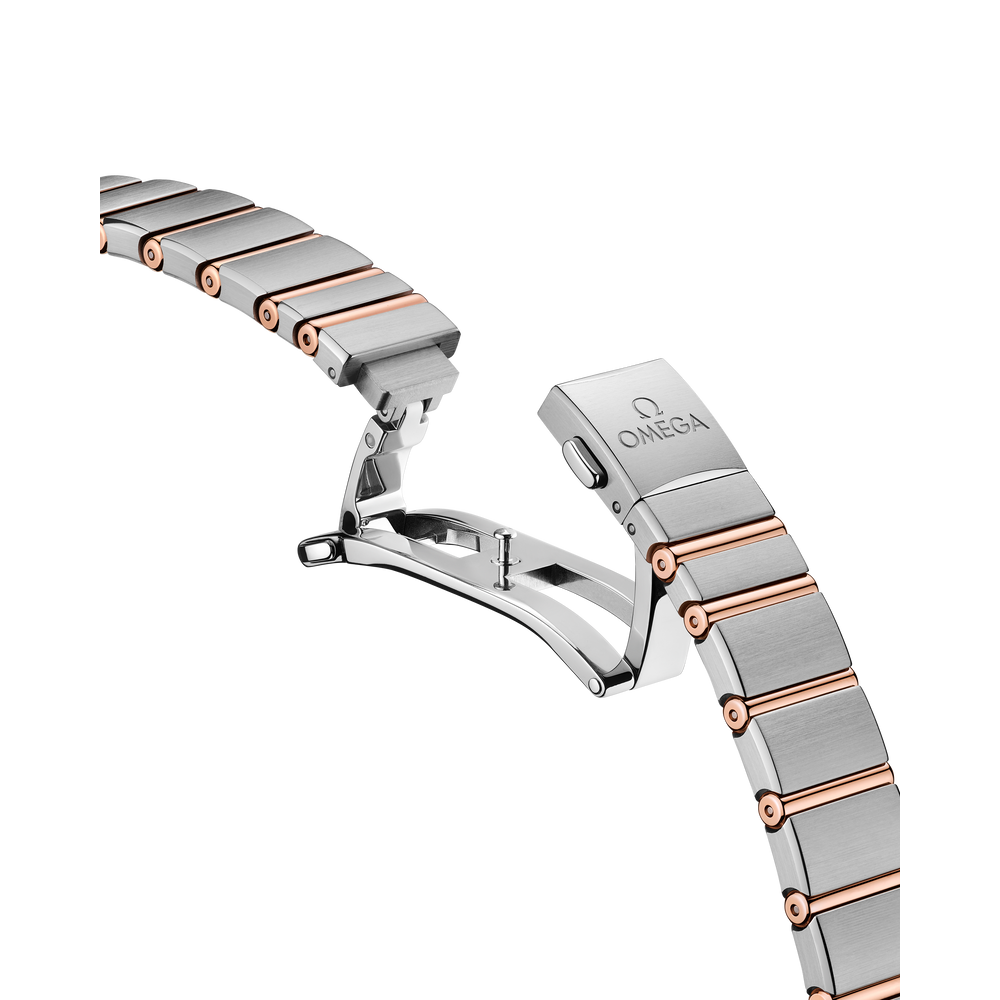 This 25 mm 18K Sedna™ gold and stainless steel model features a bezel engraved with Roman numerals, crystal white silvery dial and scratch-resistant saphire crystal. The hands, OMEGA logo, Constellation star and indexes are also in 18K Sedna™ gold.
