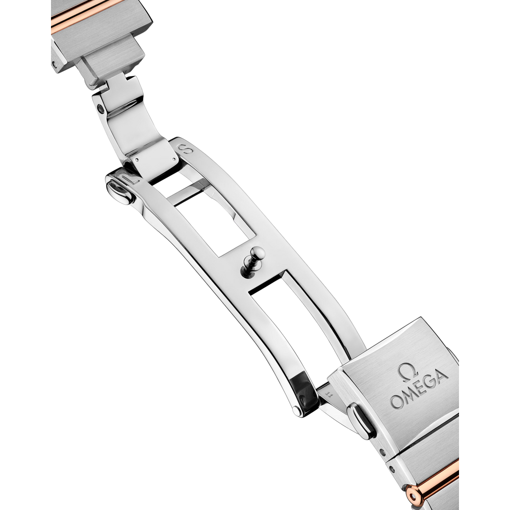 This 28 mm 18K Sedna™ gold and stainless steel model features a bezel engraved with Roman numerals, crystal white silvery dial with diamond hour markers and scratch-resistant sapphire crystal. The hands, OMEGA logo, Constellation star and diamond holders are also in 18K Sedna™ gold.