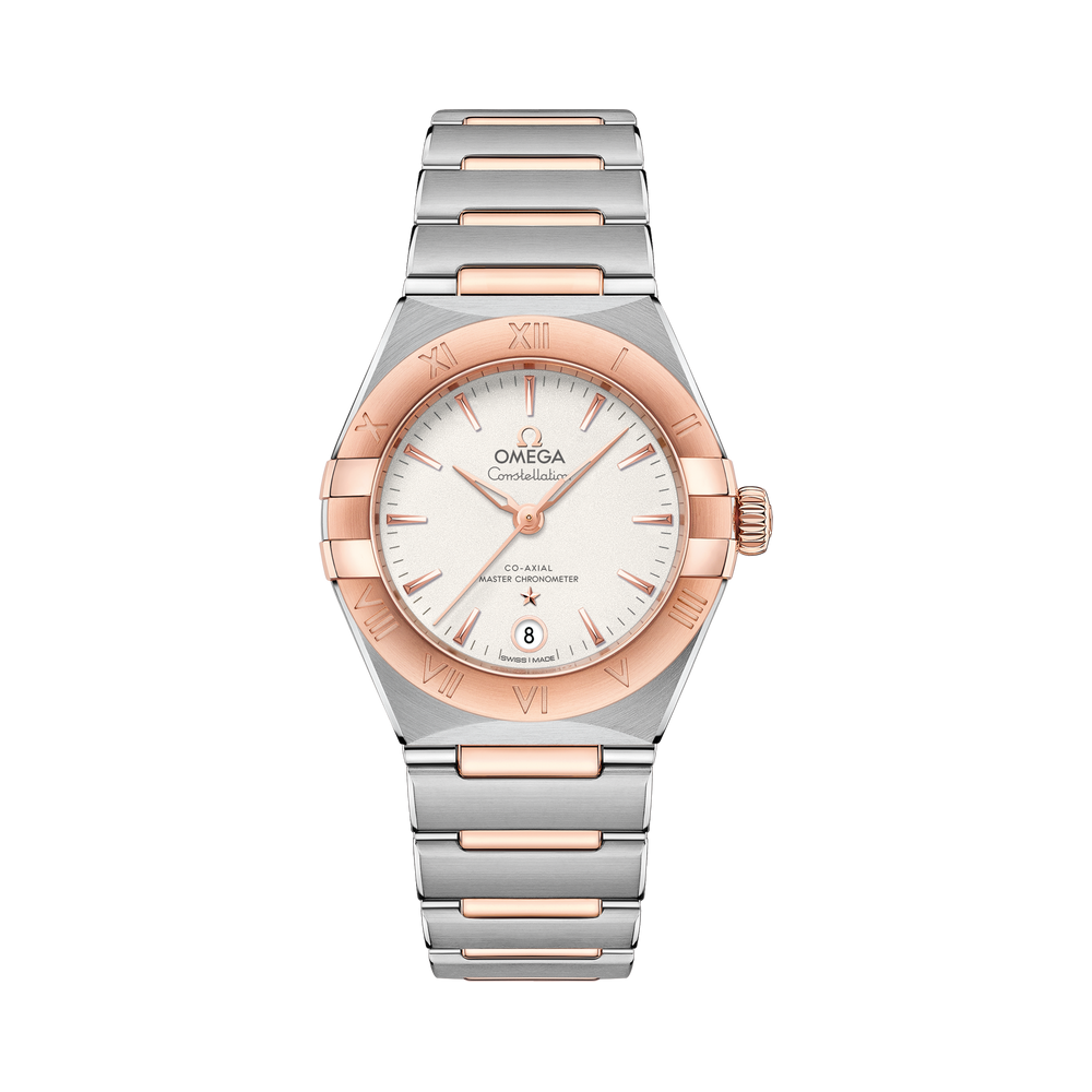 This 29 mm 18K Sedna™ gold and stainless steel model features a bezel engraved with Roman numerals, crystal white silvery dial and a date window at the 6 o'clock position. The hands, OMEGA logo, Constellation star and indexes are also in 18K Sedna™ gold.