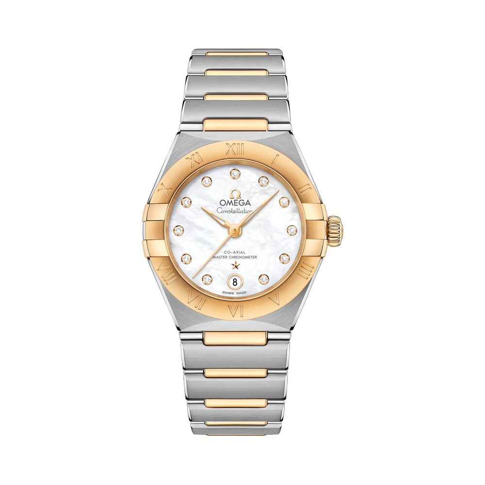 This 29 mm 18K yellow gold and stainless steel model features a bezel engraved with Roman numerals, pearled mother-of-pearl dial with diamond hour markers and a date window at the 6 o'clock position. The hands, OMEGA logo, Constellation star and diamond holders are also in 18K yellow gold.