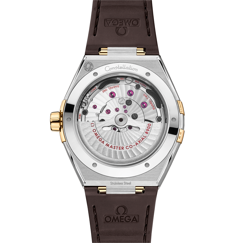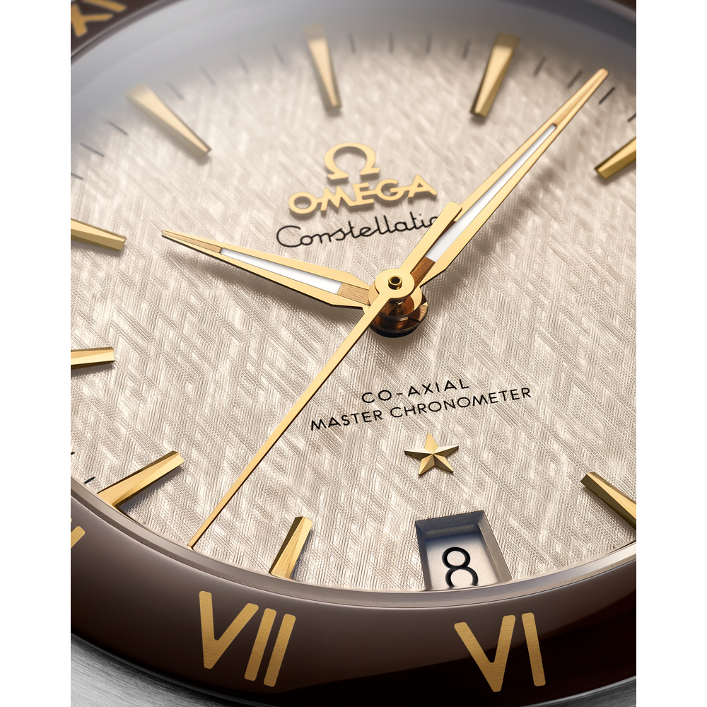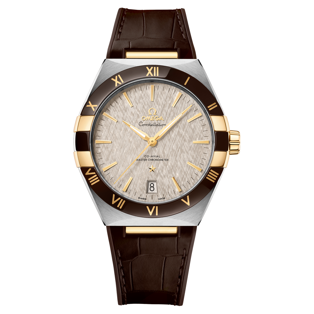 This 41 mm model, in stainless steel and 18K Yellow gold, features a brown polished ceramic bezel ring with Roman numerals filled with OMEGA Ceragold™. It has rhodium-grey dial with silk-embossed finish and a date window at the 6 o'clock position. The hands, OMEGA logo, Constellation star and indexes are also in 18K Yellow gold.
