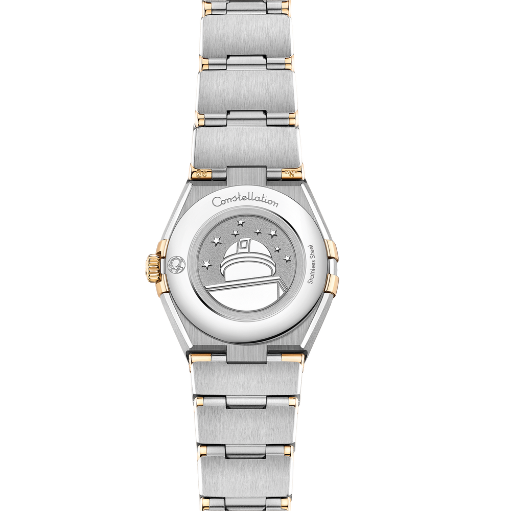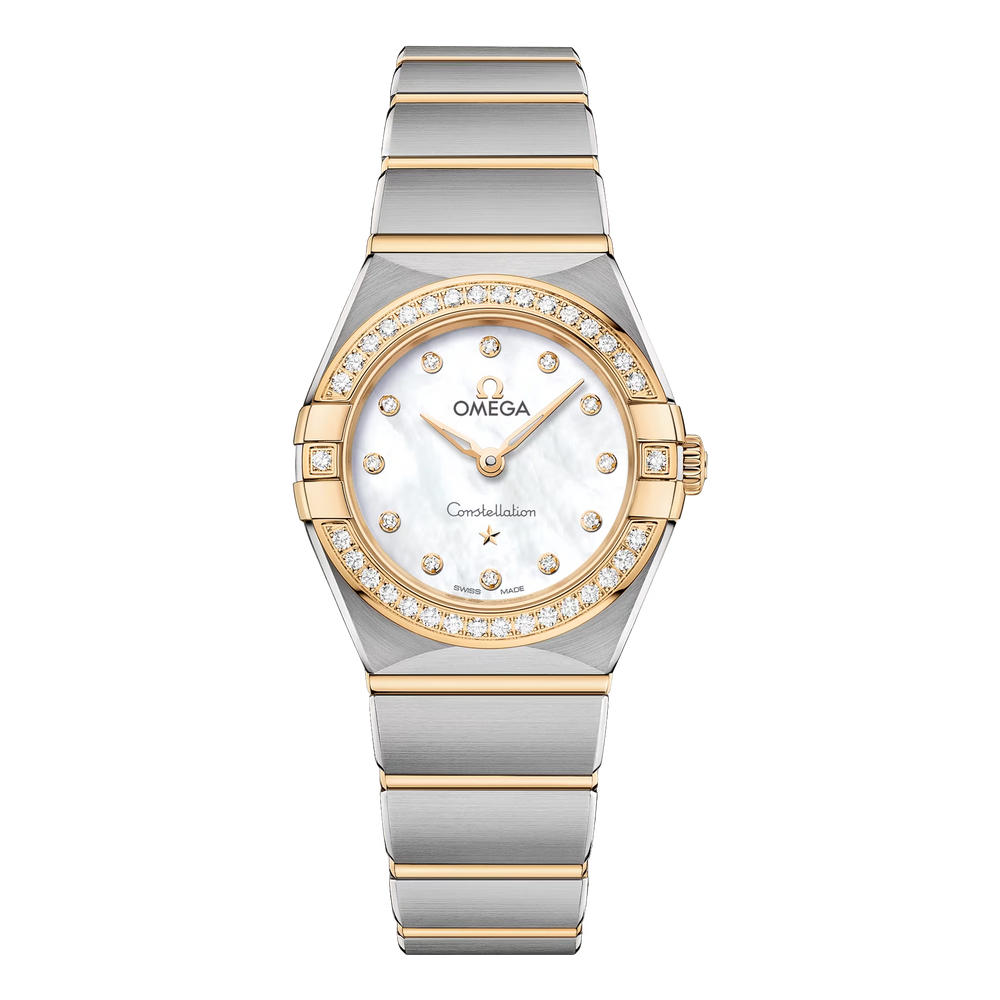This 25 mm 18K yellow gold and stainless steel model features a diamond-paved bezel, white mother-of-pearl dial with diamond hour markers and scratch-resistant saphire crystal. The hands, OMEGA logo, Constellation star and diamond holders are also in 18K yellow gold.