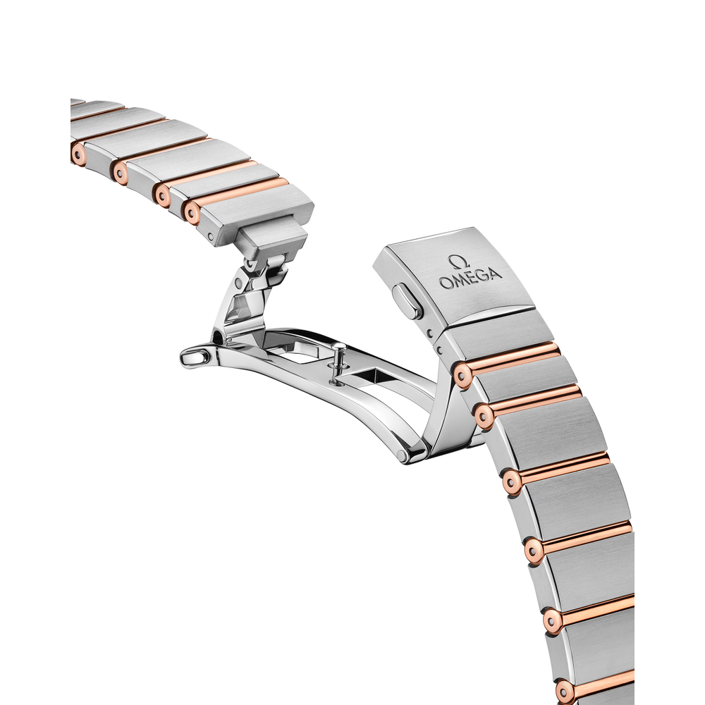 This 28 mm 18K Sedna™ gold and stainless steel model features a diamond-paved bezel, sun-brushed brown dial dial with diamond hour markers and scratch-resistant sapphire crystal. The hands, OMEGA logo, Constellation star and diamond holders are also in 18K Sedna™ gold.