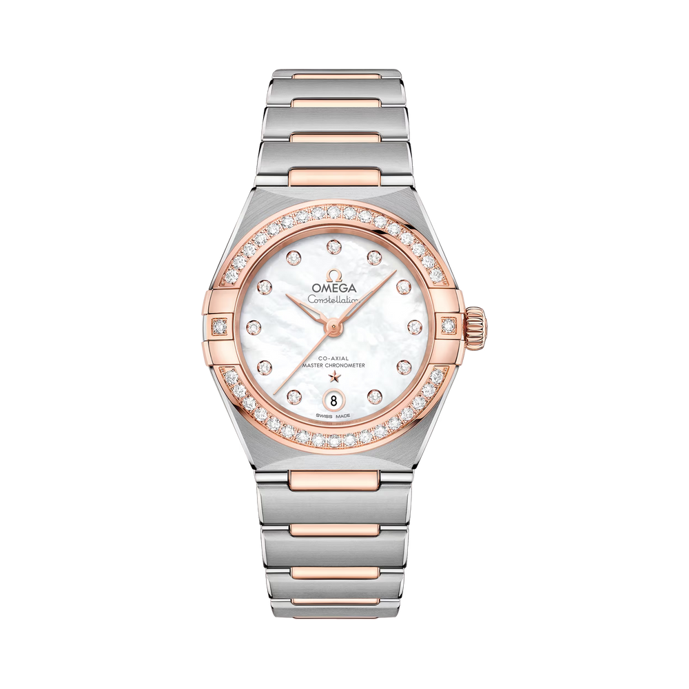 This 29 mm 18K Sedna™ gold and stainless steel model features a diamond-paved bezel, pearled mother-of-pearl dial with diamond hour markers and a date window at the 6 o'clock position. The hands, OMEGA logo, Constellation star and diamond holders are also in 18K Sedna™ gold.