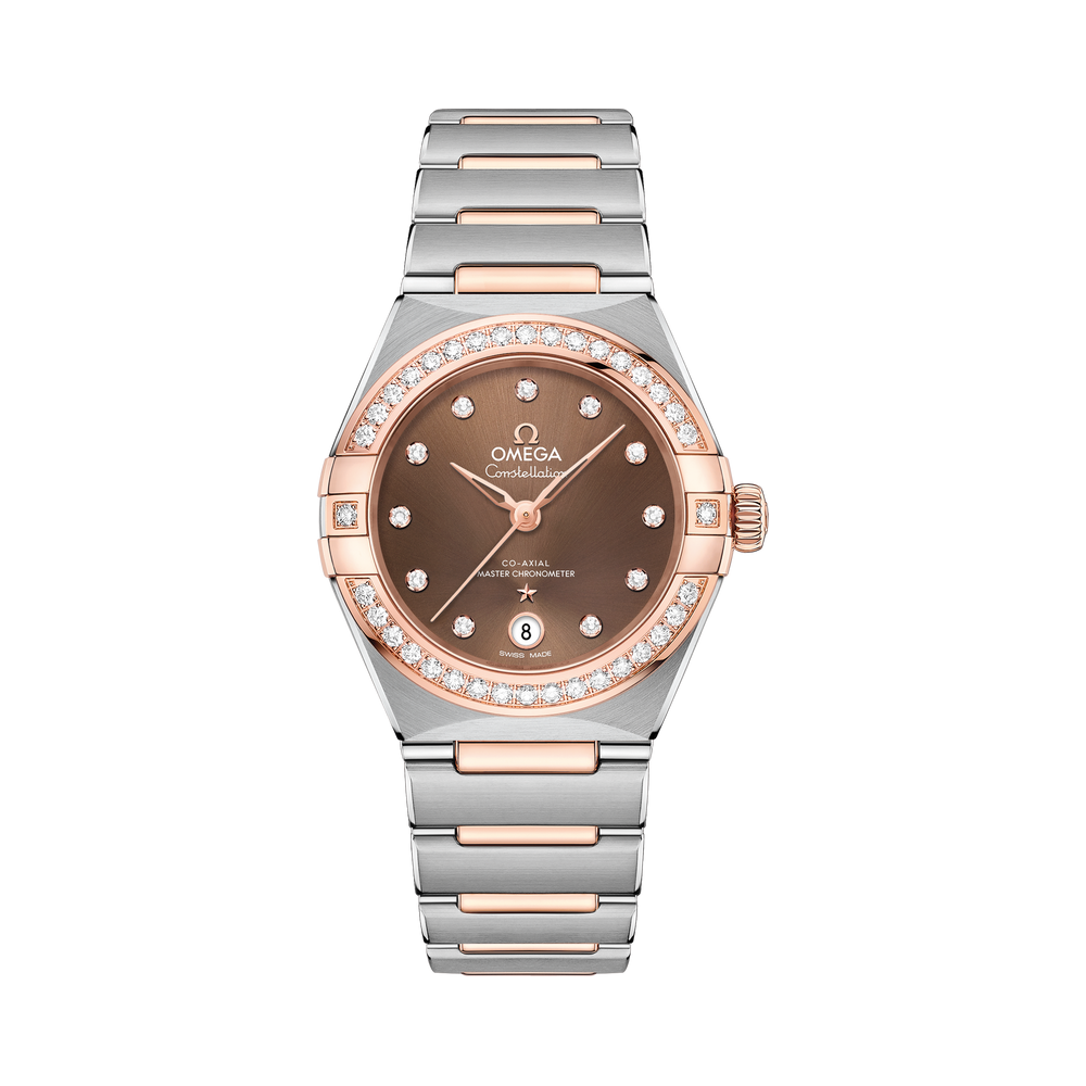 This 29 mm 18K Sedna™ gold and stainless steel model features a diamond-paved bezel, sun-brushed brown dial with diamond hour markers and date window at the 6 o'clock position. The hands, OMEGA logo, Constellation star and diamond holders are also in 18K Sedna™ gold.