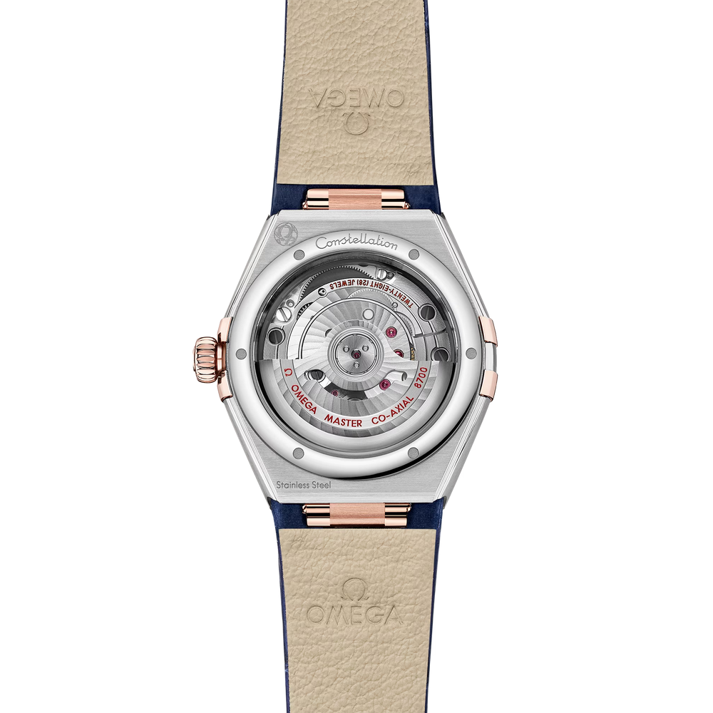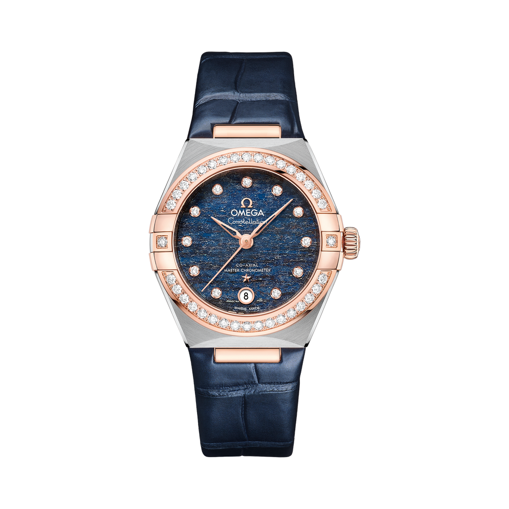 Crafted in stainless steel and 18K Sedna™ gold, it has a diamond-paved bezel and a date window at 6 o’clock. The hands, hour markers, OMEGA logo and Constellation star are in 18K Sedna™ gold.