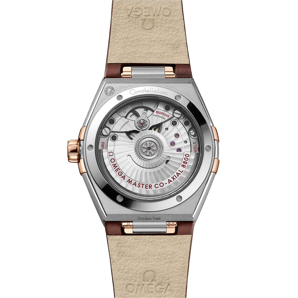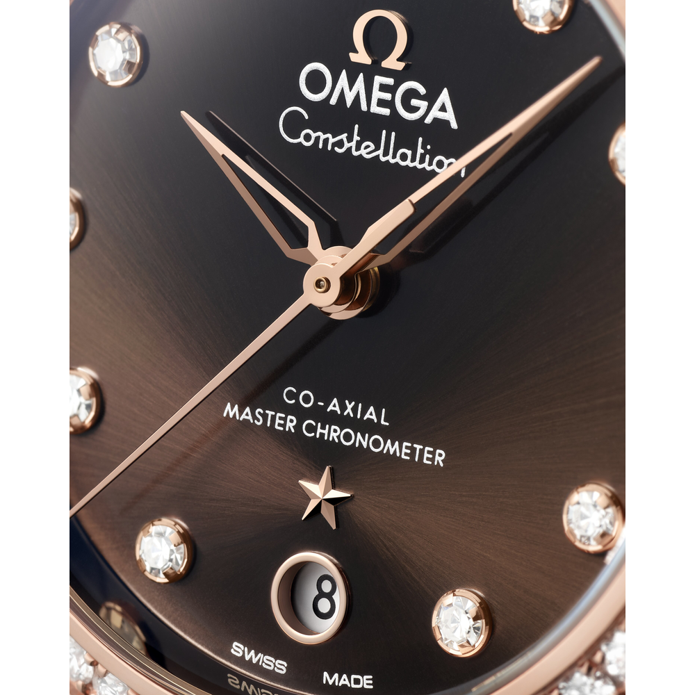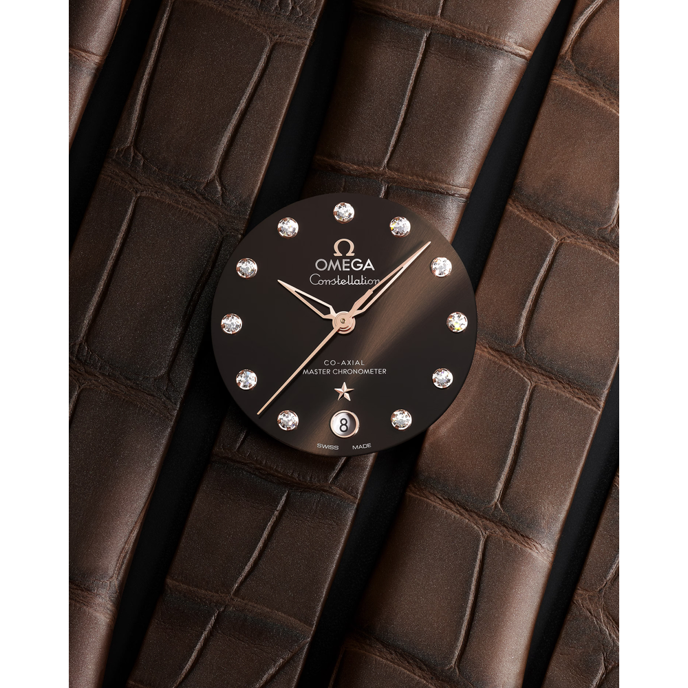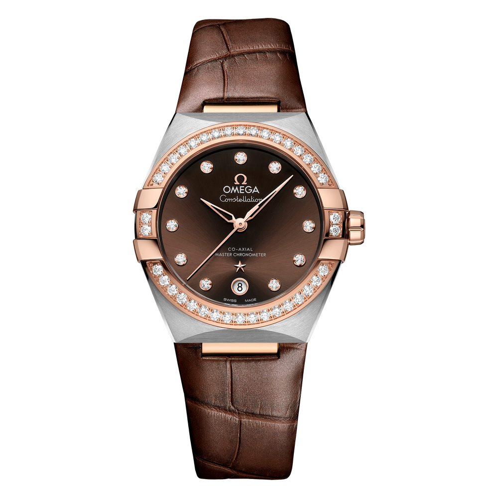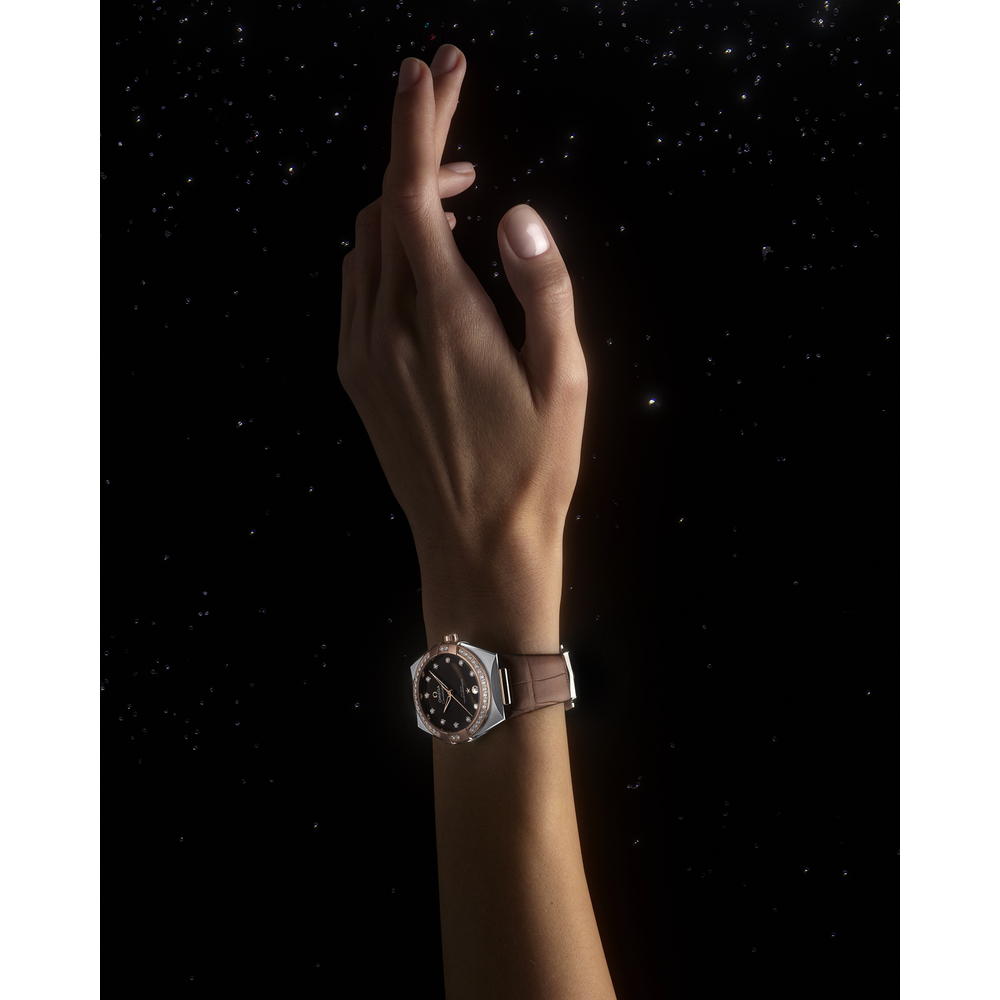 This 36 mm stainless steel and 18K Sedna™ gold model features a polished bezel set with 38 diamonds, a brown PVD treated dial with sun-brushed finish and a date window at the 6 o'clock position. The hands, OMEGA logo, Constellation star and indexes are all in 18K Sedna™ gold.