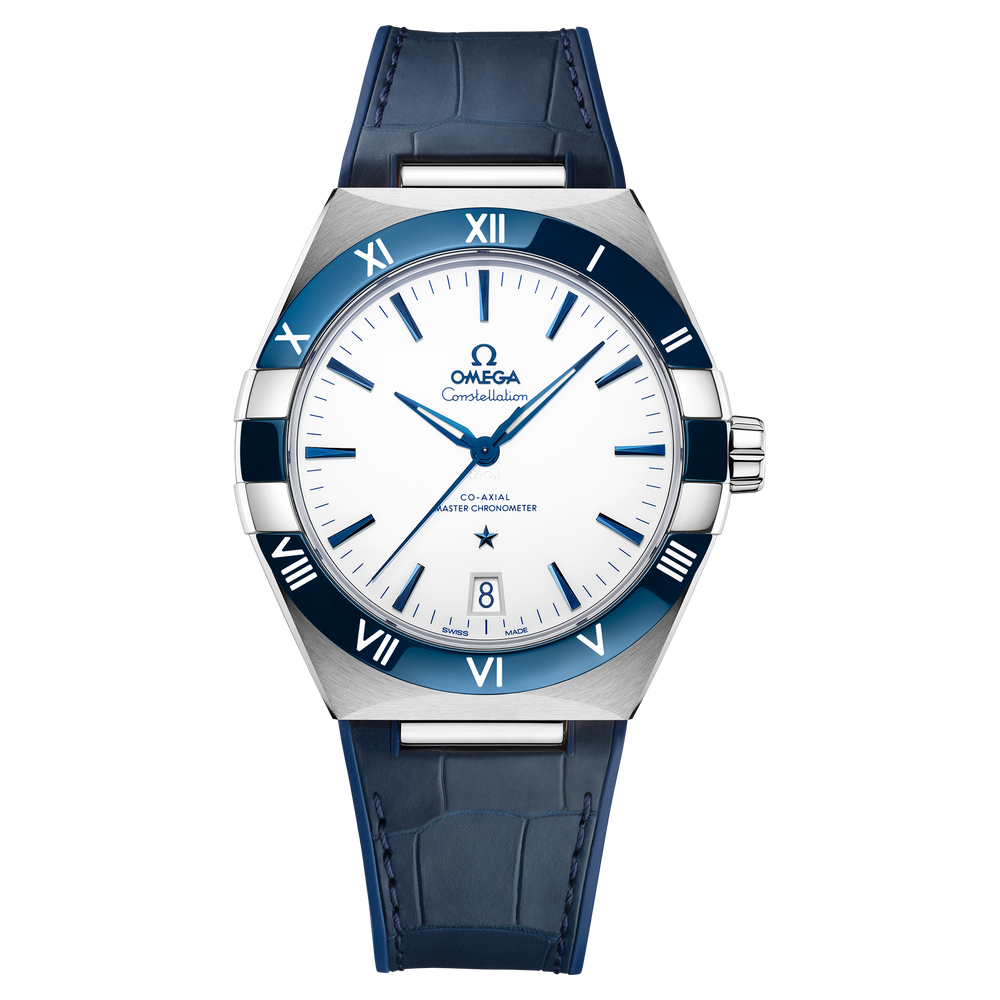 This 41 mm stainless steel model features a polished blue ceramic bezel with Roman numerals in “Grand Feu” white enamel, a white ceramic dial and a date window at the 6 o'clock position. The hands, OMEGA logo, Constellation star and facetted indexes are all blued.