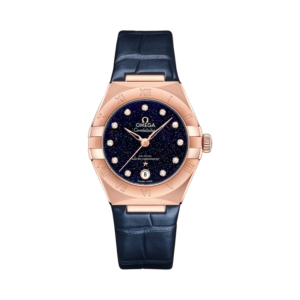This 29 mm 18K Sedna™ gold model features a bezel with engraved Roman numerals, blue aventurine glass dial with diamond hour markers and a date window at the 6 o'clock position. The hands, OMEGA logo, Constellation star and diamond holders are also in 18K Sedna™ gold.