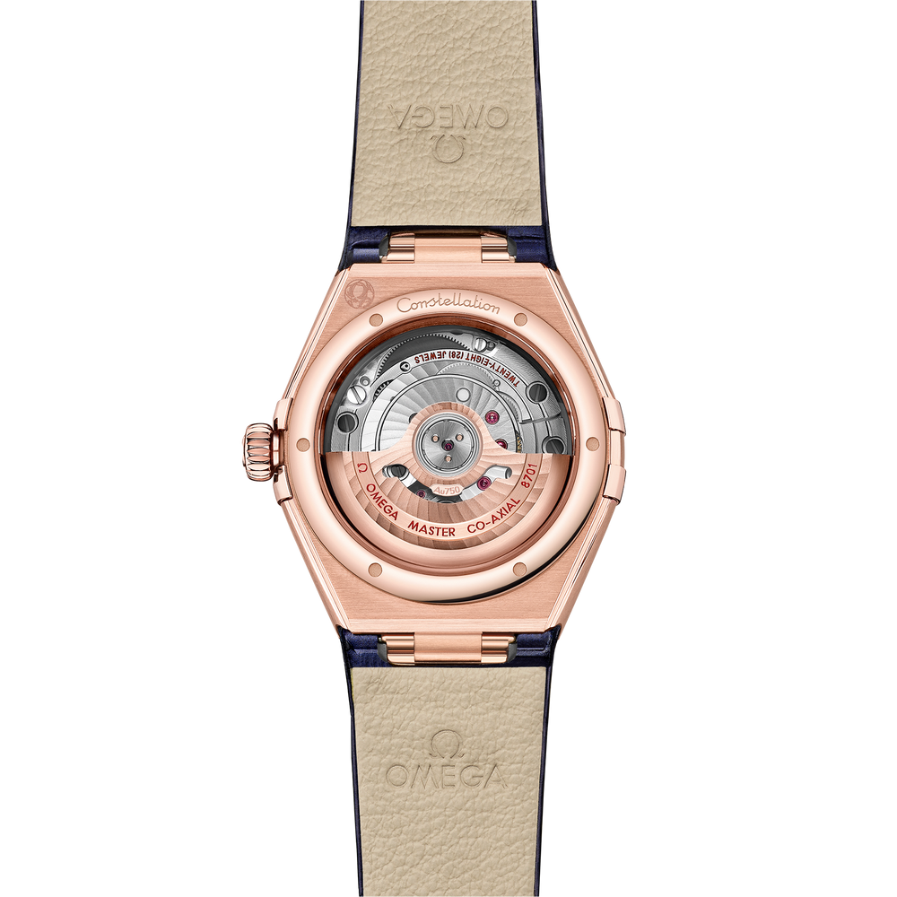 At the heart of this timepiece is the OMEGA Co-Axial Master Chronometer Calibre 8701, visible through the domed scratch-resistant sapphire crystal.