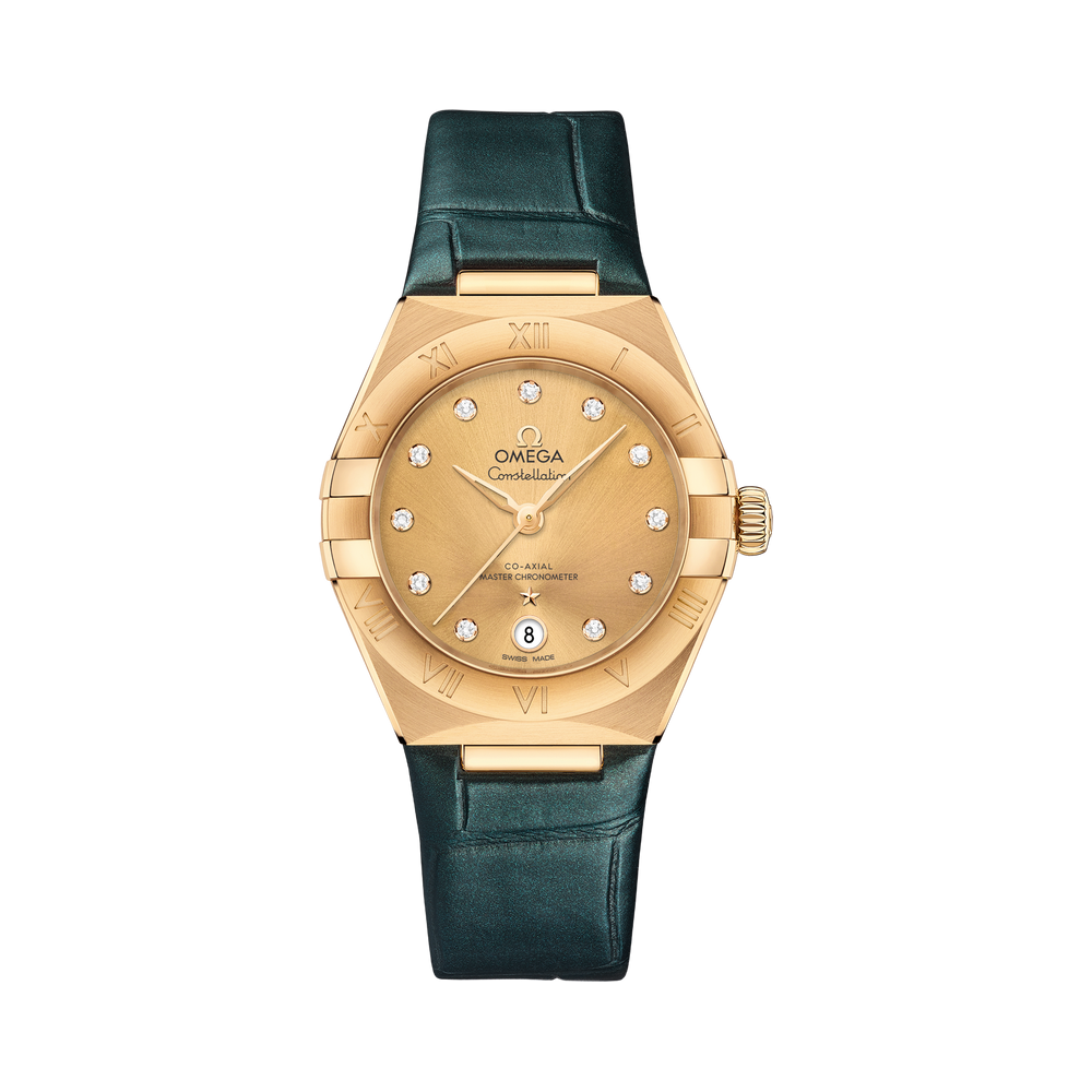This 29 mm 18K yellow gold model features a bezel with engraved Roman numerals, sun-brushed champagne dial with diamond hour markers and a date window at the 6 o'clock position. The hands, OMEGA logo, Constellation star and diamond holders are also in 18K yellow gold.