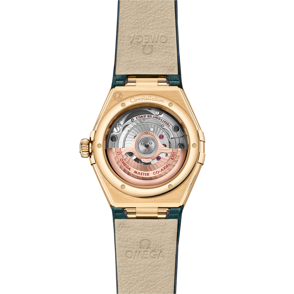 At the heart of this timepiece is the OMEGA Co-Axial Master Chronometer Calibre 8701, visible through the domed scratch-resistant sapphire crystal.