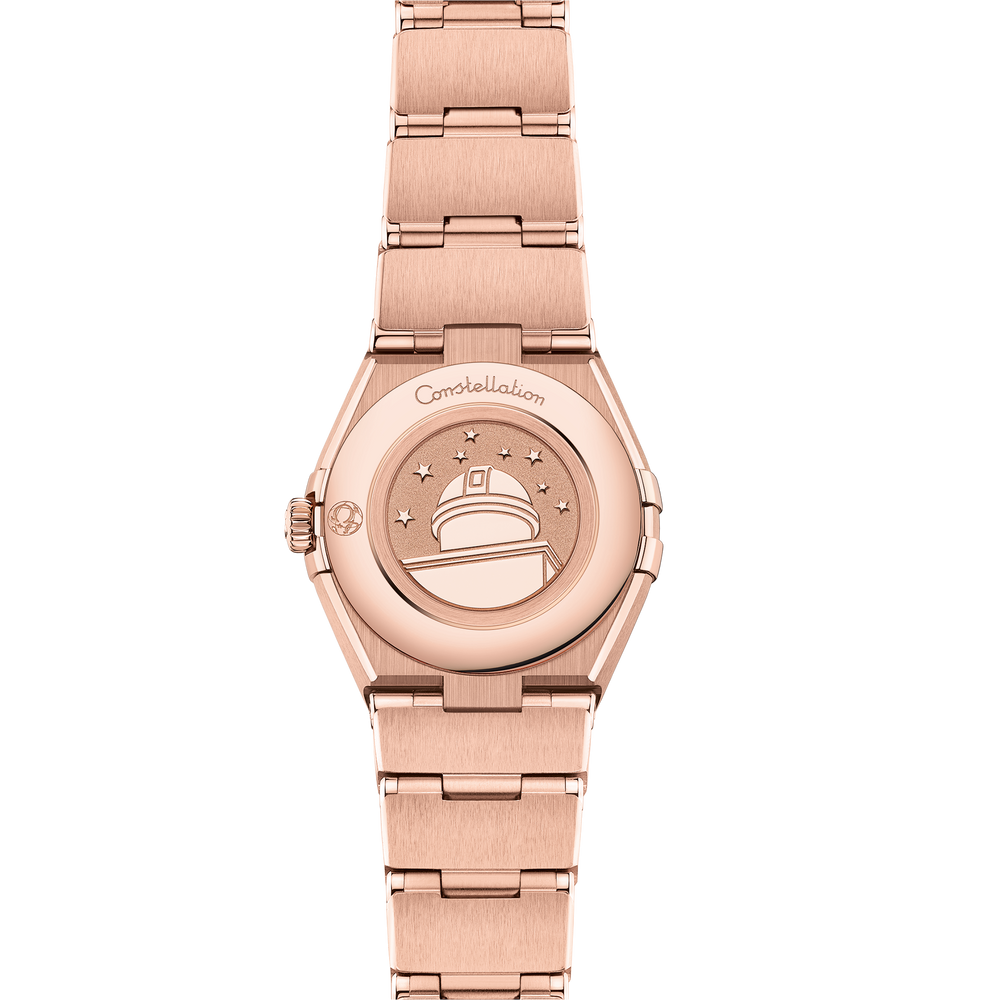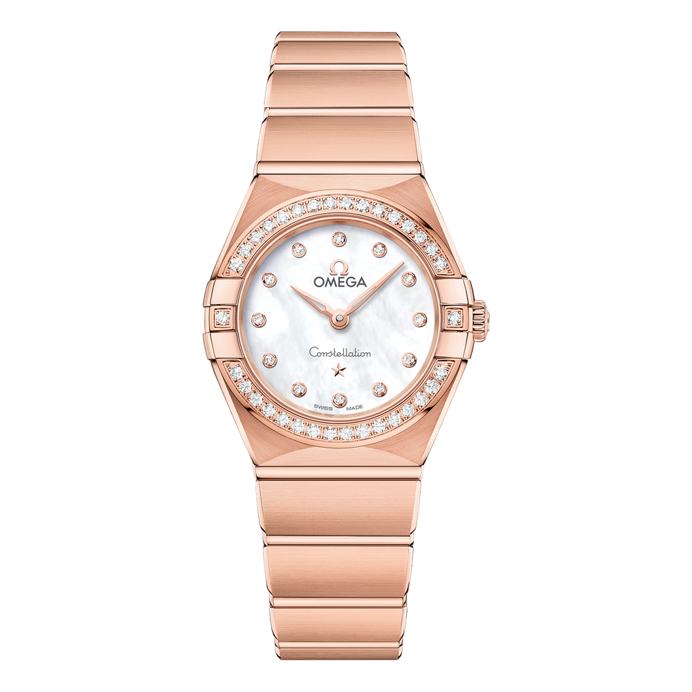 This 25 mm 18K Sedna™ gold model features a diamond-paved bezel, white mother-of-pearl dial with diamond hour markers and scratch-resistant saphire crystal. The bracelet, hands, OMEGA logo, Constellation star and diamond holders are also in 18K Sedna™ gold.