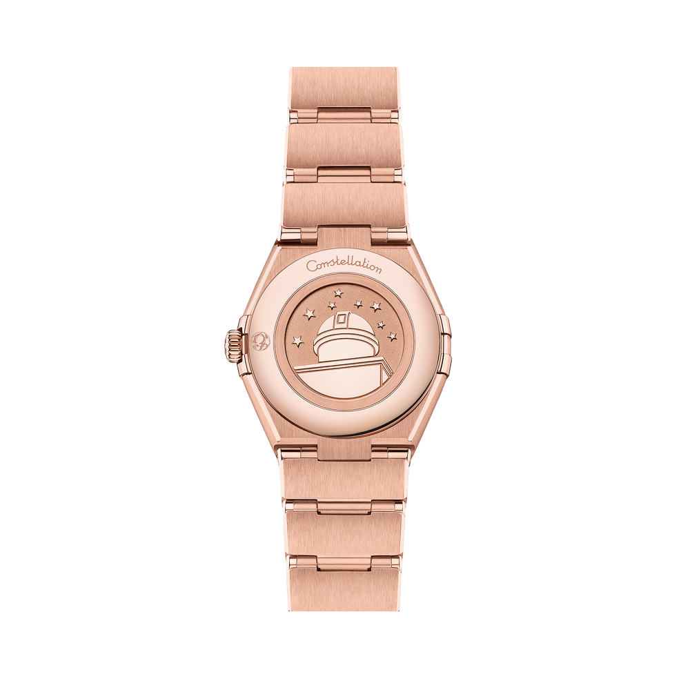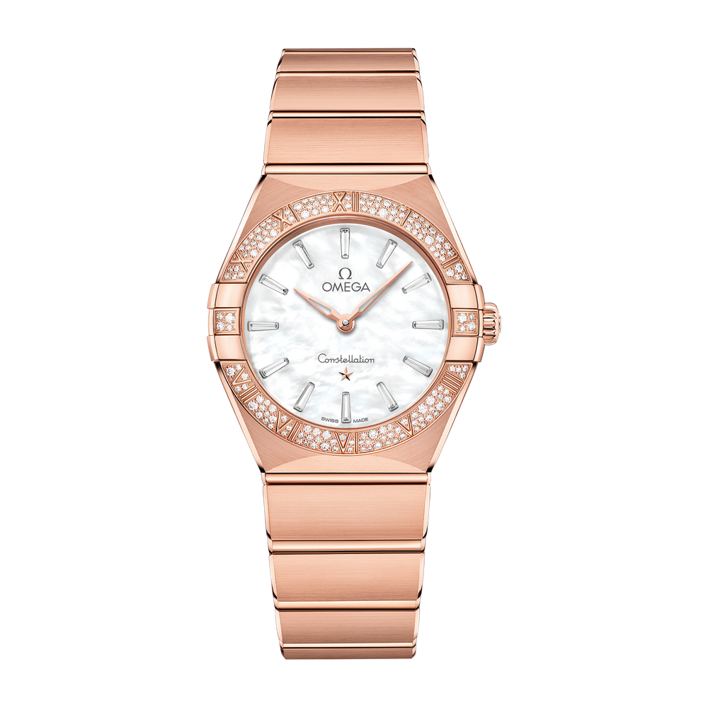 The dramatic and enduring design of the OMEGA Constellation Manhattan is characterised by its famous half-moons, “claws” on the case and iconic mono-rang bracelet.In this 28 mm jewellery model, 18K Sedna™ gold has been used to create the case and bracelet, as well as the bezel with its subtle Roman numerals and 154 snow-paved diamonds. The white pearled mother-of-pearl dial includes skeletonised hands and baguette-cut diamonds that are inspired by the Manhattan skyline.At the heart of this timepiece is the OMEGA Calibre 4061, which is set behind an OMEGA Observatory medallion on the caseback.