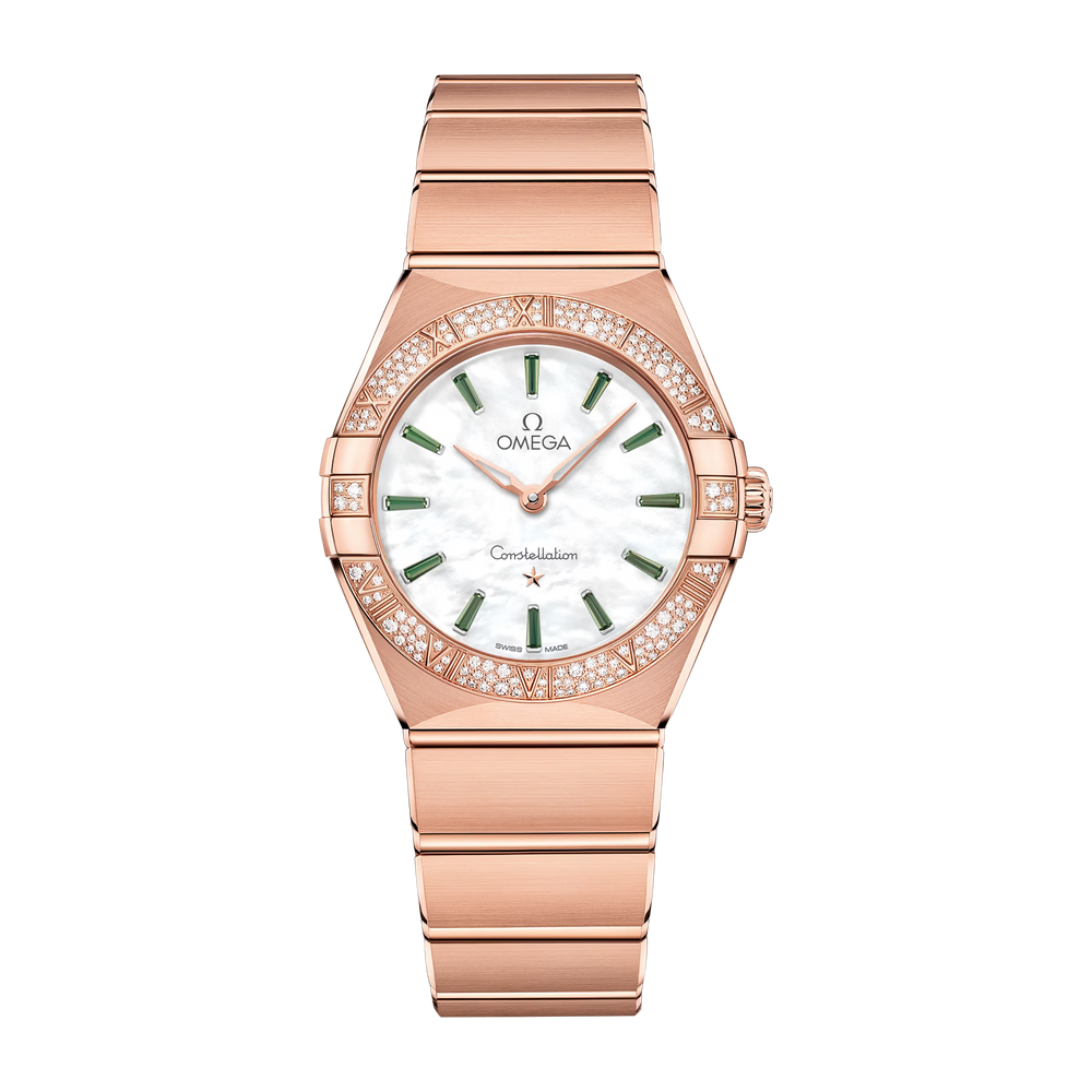 The dramatic and enduring design of the OMEGA Constellation Manhattan is characterised by its famous half-moons, “claws” on the case and iconic mono-rang bracelet.In this 28 mm jewellery model, 18K Sedna™ gold has been used to create the case and bracelet, as well as the bezel with its subtle Roman numerals and 154 snow-paved diamonds. The white mother-of-pearl dial includes skeletonised hands and baguette-cut emeralds that are inspired by the Manhattan skyline.At the heart of this timepiece is the OMEGA Calibre 4061, which is set behind an OMEGA Observatory medallion on the caseback.