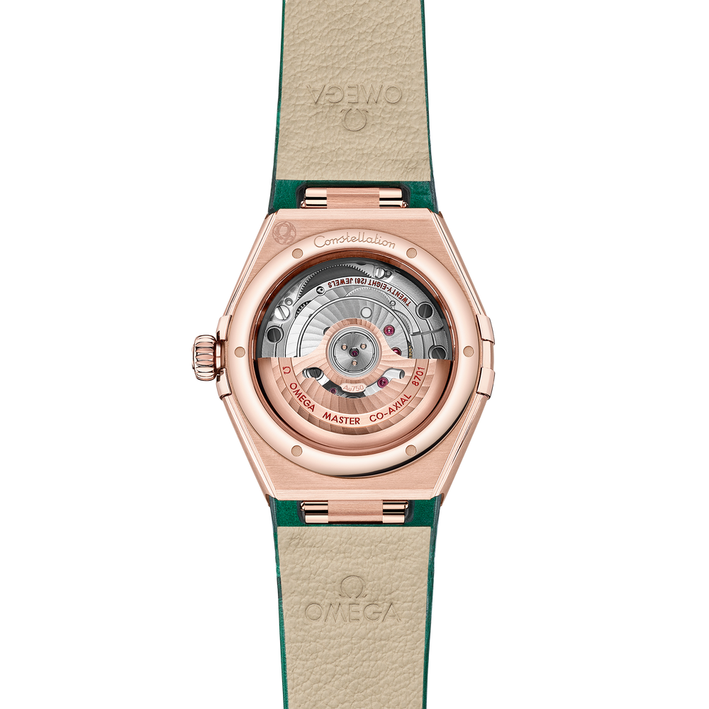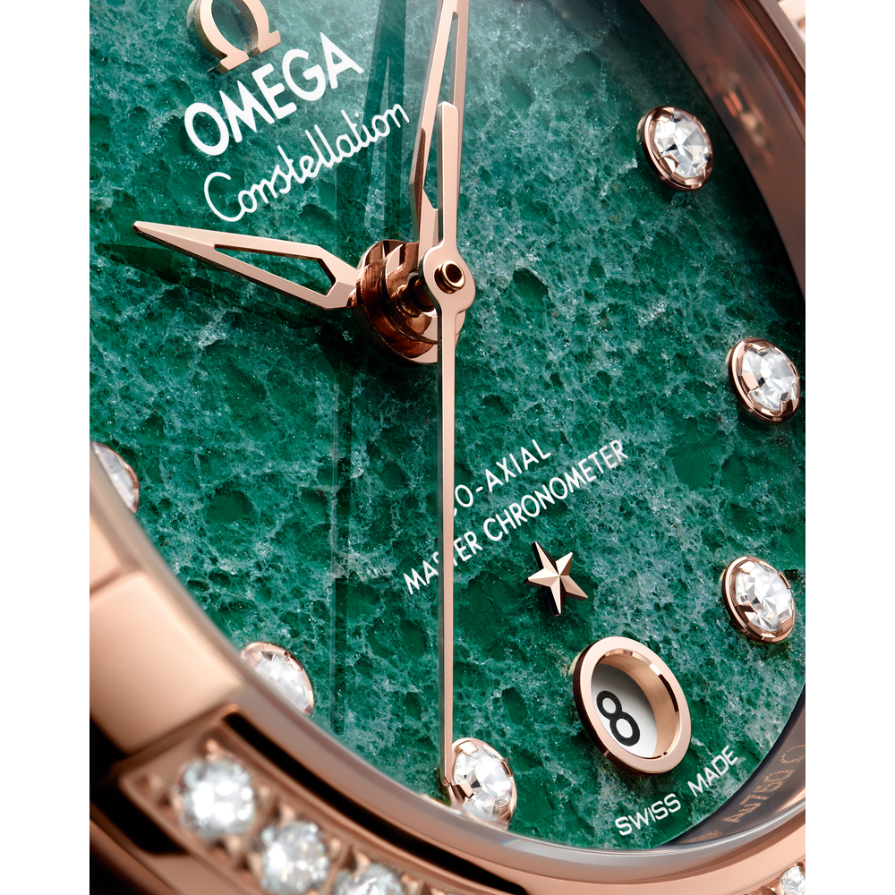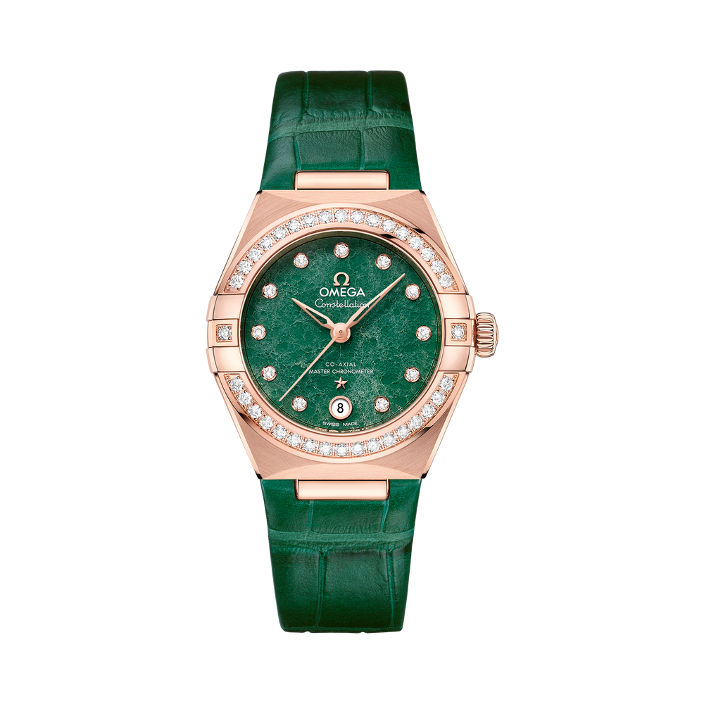 Crafted in 18K Sedna™ gold, it has a diamond-paved bezel and a date window at 6 o’clock. The hands, hour markers, OMEGA logo and Constellation star are in 18K Sedna™ gold.