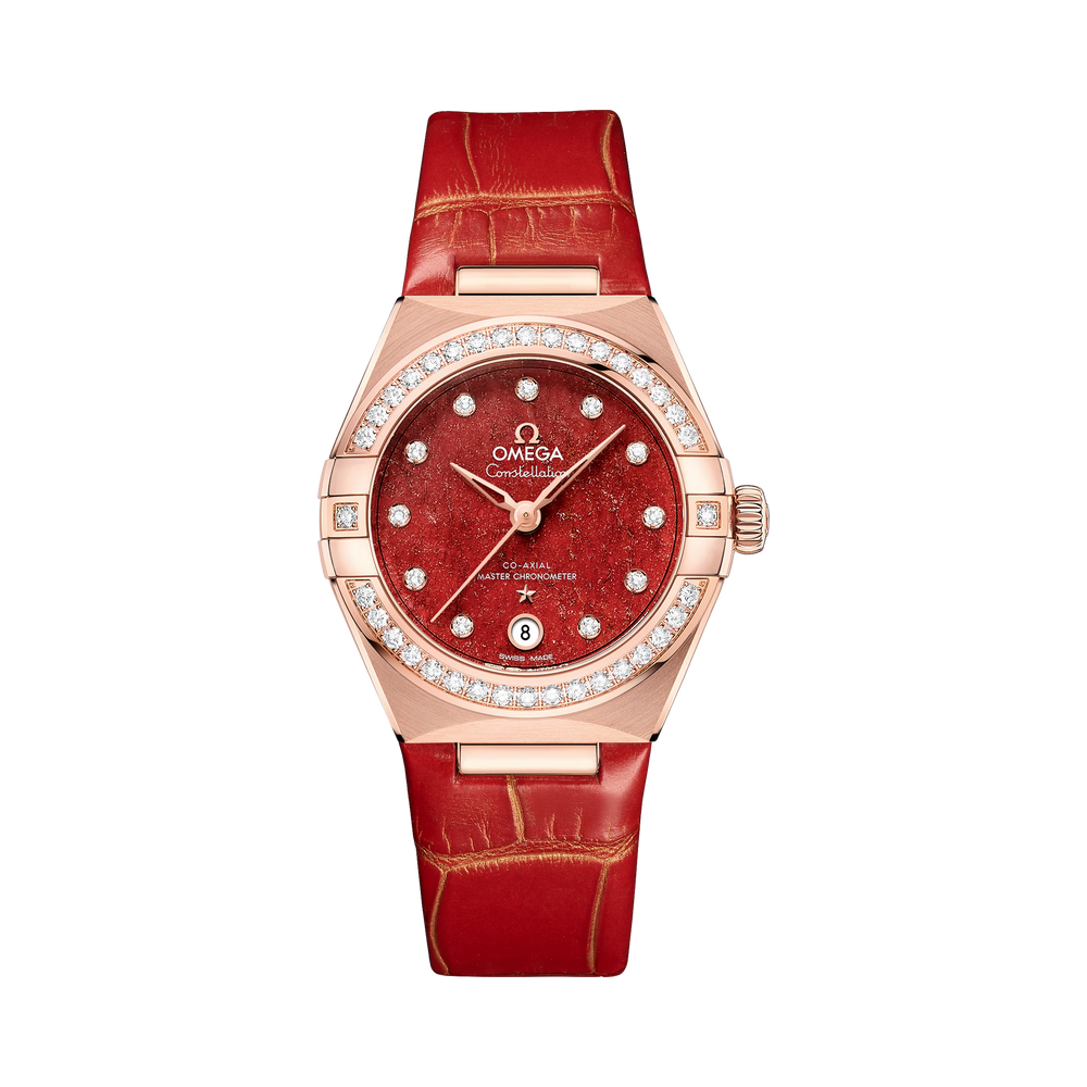 Standout features on this 29 mm model are the dial made from natural red Aventurine stone and the shimmering leather strap in matching colour.