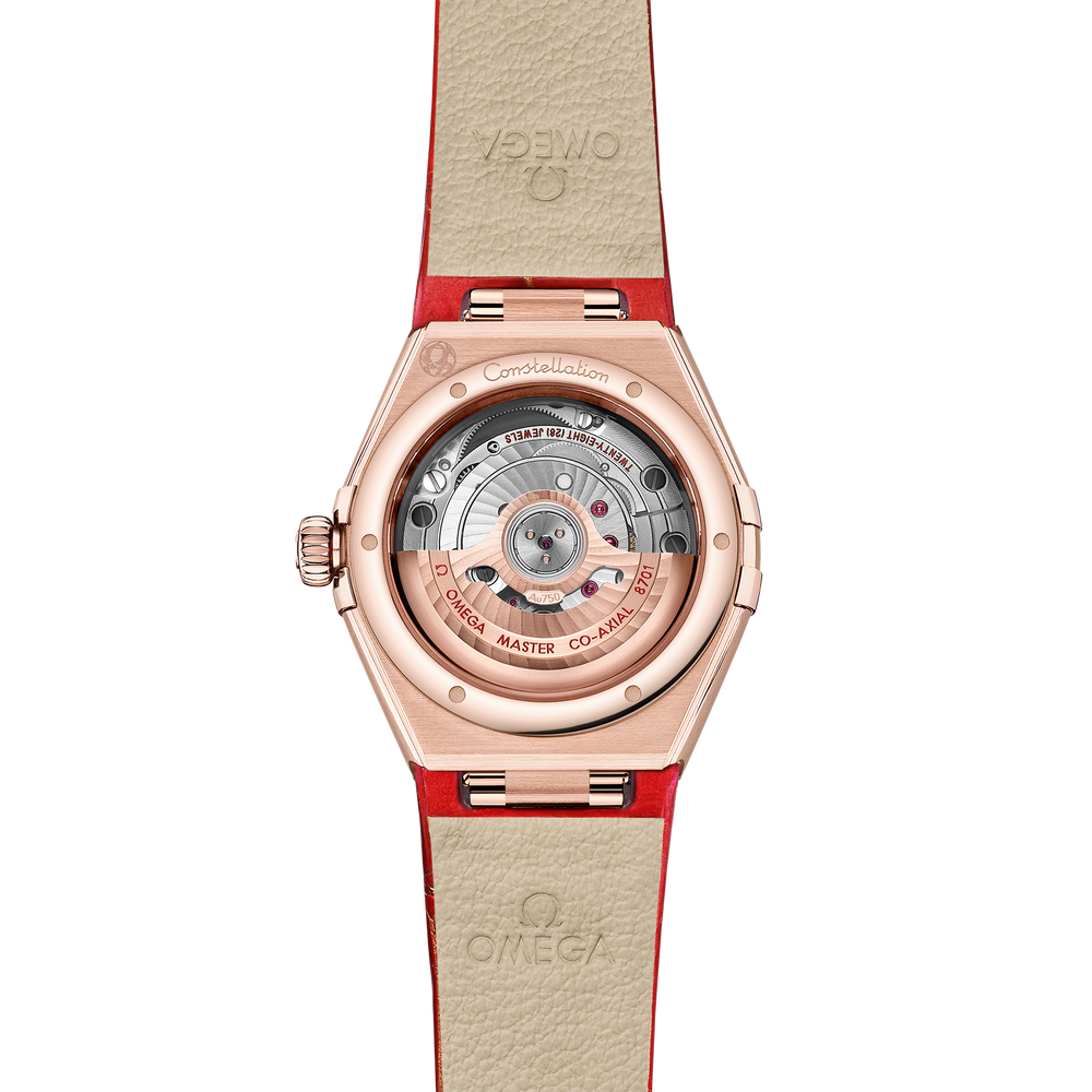 At the heart of this timepiece is the OMEGA Co-Axial Master Chronometer Calibre 8701, visible through the domed scratch-resistant sapphire crystal.