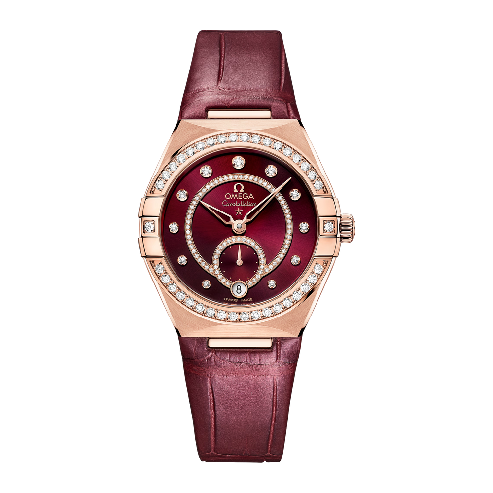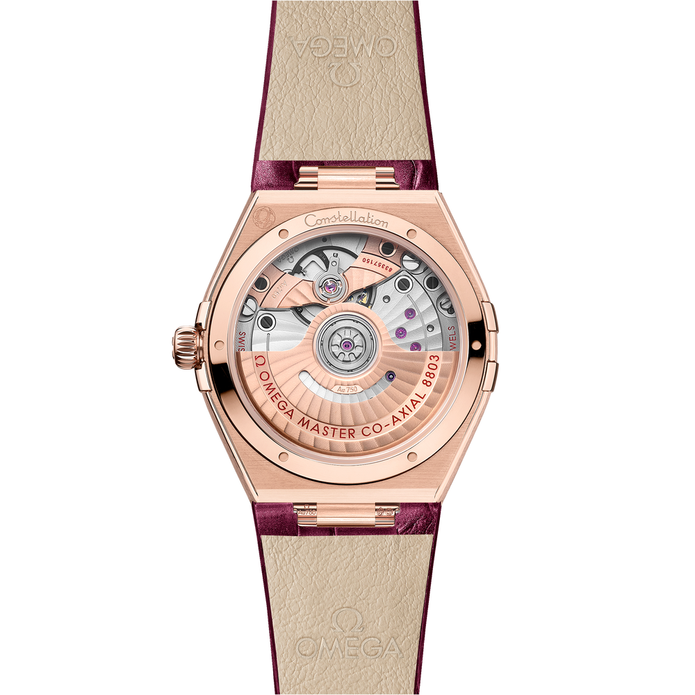 Presented on a shimmering burgundy leather strap, the timepiece is driven by the OMEGA Co-Axial Master Chronometer Calibre 8803, visible through the domed scratch-resistant sapphire crystal.