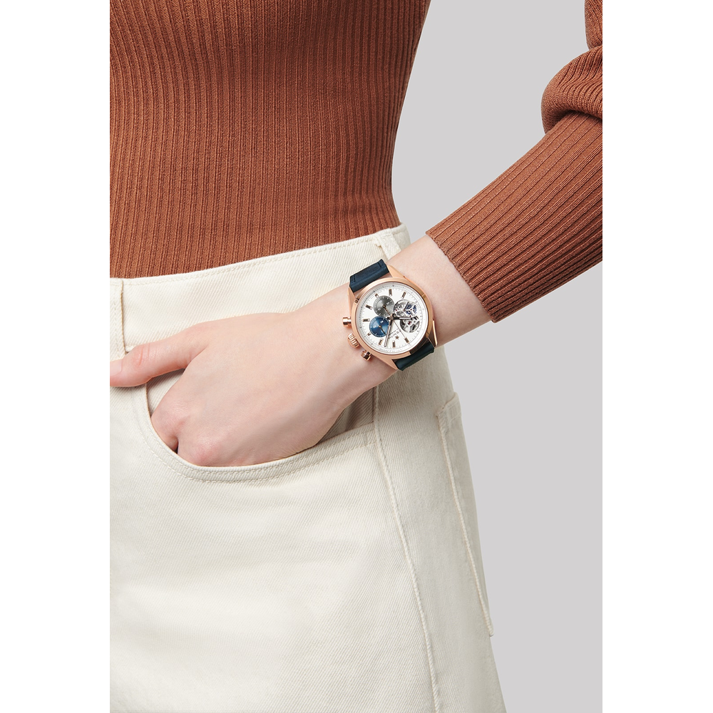The CHRONOMASTER Open offers a view of the beating heart of the El Primero movement from the dial. Crafted in a sleek 39.5mm 18K rose gold case, this version features a matte silver dial with tricolour counters and a transparent counter for the running seconds, paired with a blue calfskin leather strap. Powered by the El Primero 3604 1/10th of a second automatic chronograph movement.