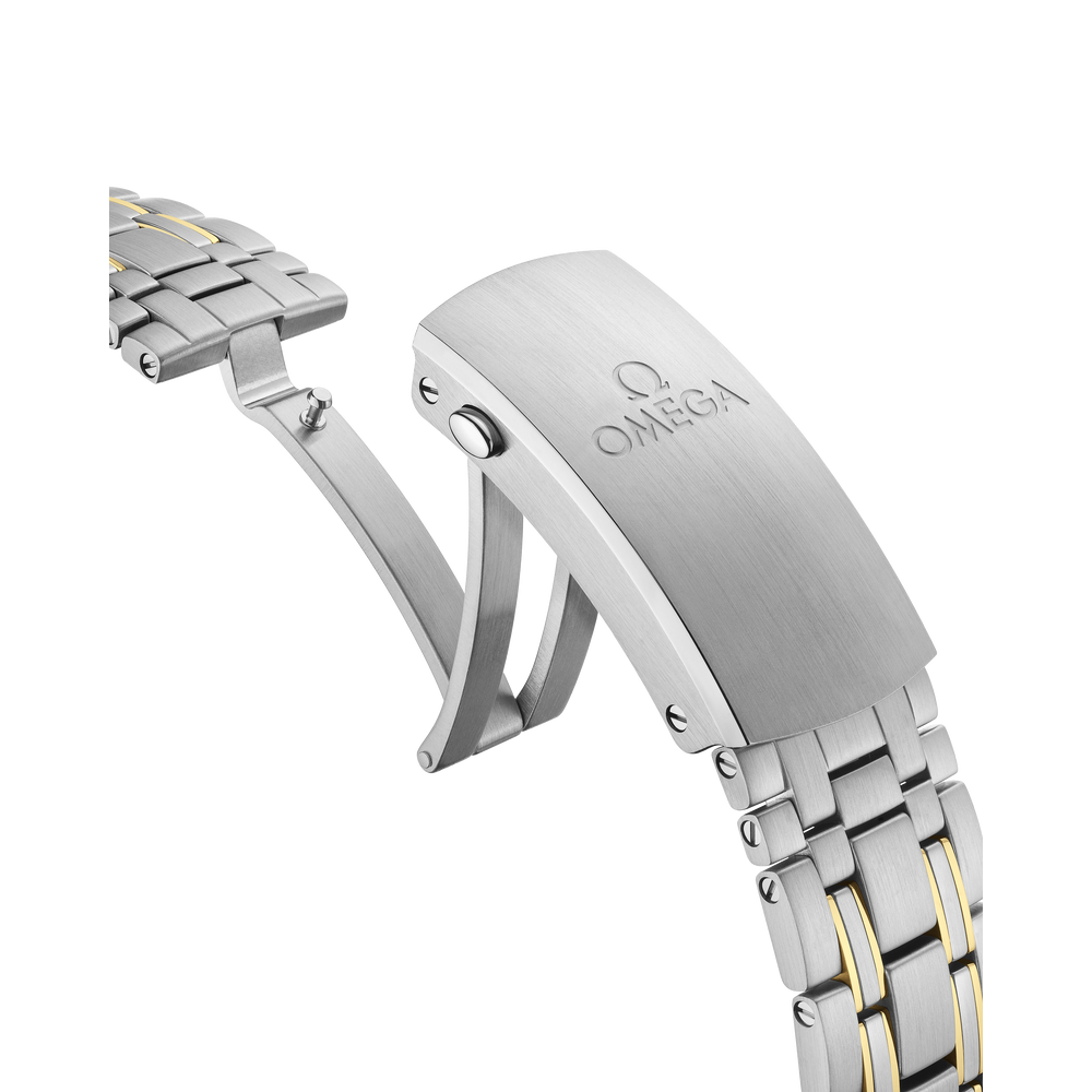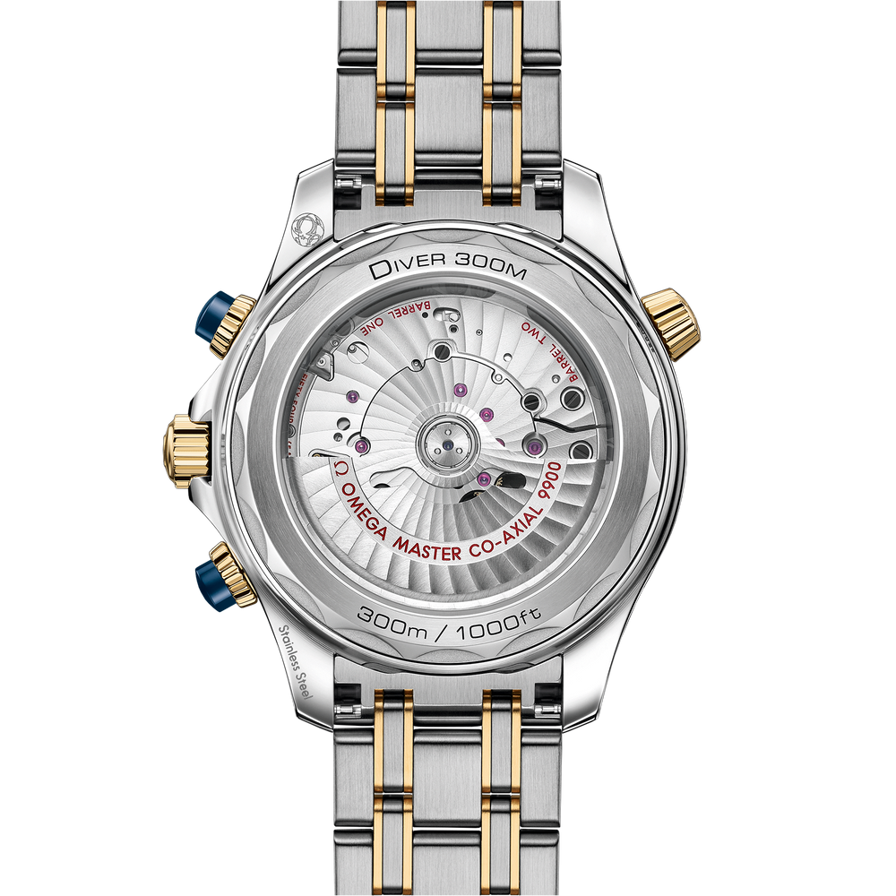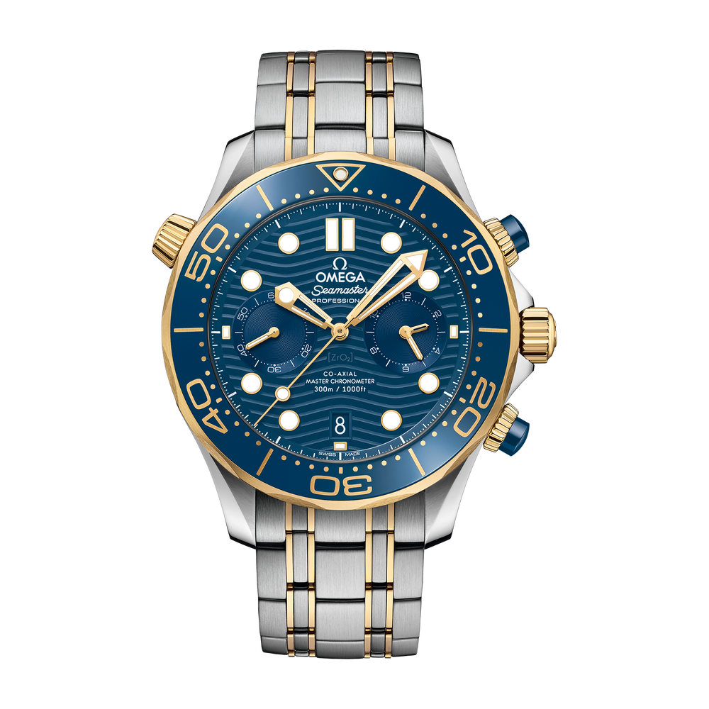 Since 1993, the Seamaster Professional Diver 300M has enjoyed a legendary following. Today’s modern collection has embraced that famous ocean heritage and updated it with OMEGA’s best innovation and design.This 44 mm chronograph model is crafted from stainless steel and 18K yellow gold, and includes a polished blue ceramic bezel with a Ceragold™ diving scale. The pushers are also polished blue ceramic, as well as the dial which features laser-engraved waves and a date window at 6 o’clock.The subdial hands are 18K yellow gold, along with all other hands and indexes which are filled with white Super-LumiNova.The watch is presented on a stainless steel and 18K yellow gold bracelet and is driven by the OMEGA Master Chronometer Calibre 9900, which can be seen through the sapphire-crystal on the wave-edged caseback.