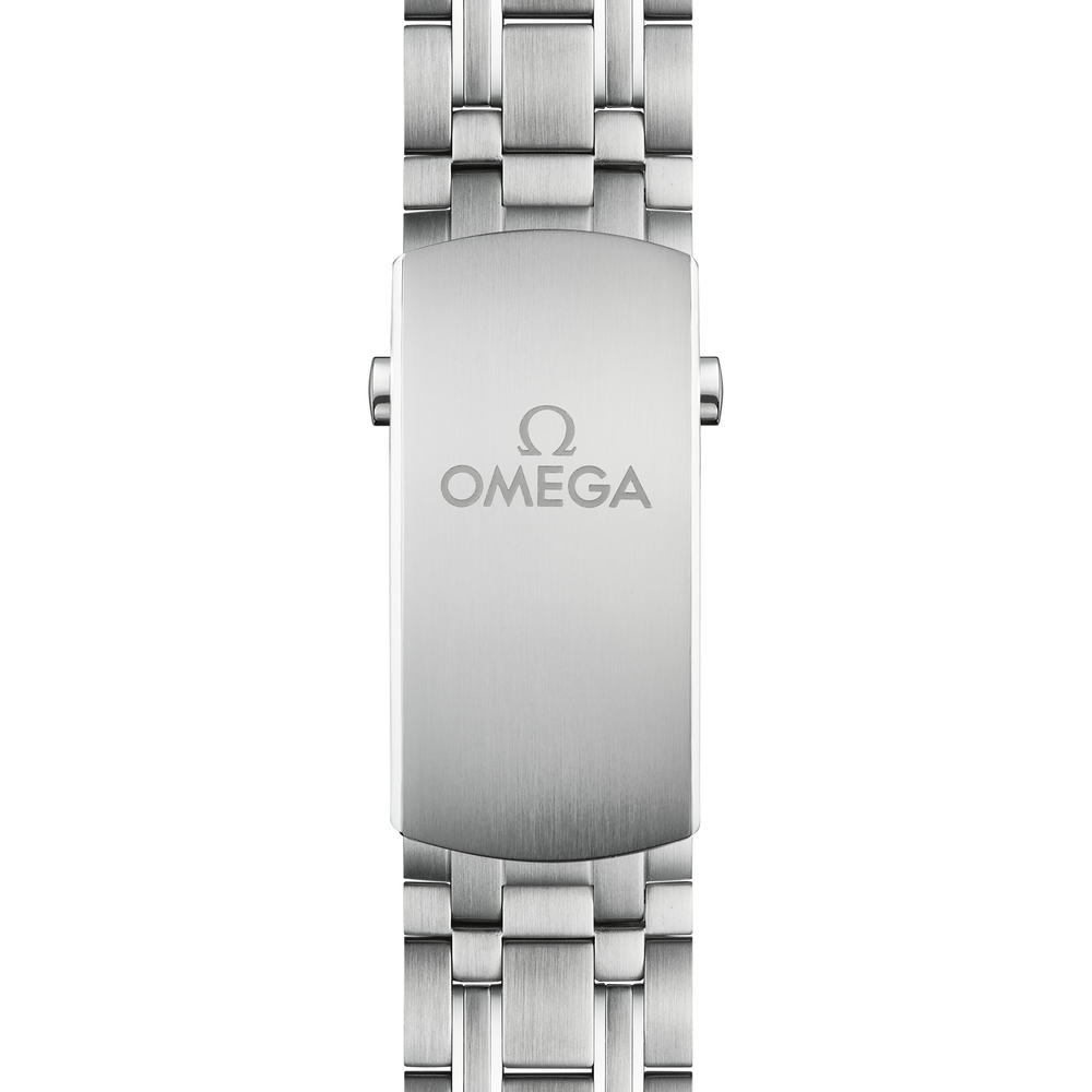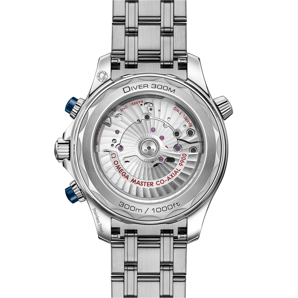 Since 1993, the Seamaster Professional Diver 300M has enjoyed a legendary following. Today’s modern collection has embraced that famous ocean heritage and updated it with OMEGA’s best innovation and design.This 44 mm chronograph model is crafted from stainless steel and includes a polished blue ceramic bezel with a white enamel diving scale. The pushers are also polished blue ceramic, while the dial is sun-brushed PVD chrome colour ceramic and features laser-engraved waves and a date window at 6 o’clock.The subdial hands are blued, along with all other hands and indexes which are filled with white Super-LumiNova.The watch is presented on a stainless steel bracelet and is driven by the OMEGA Master Chronometer Calibre 9900, which can be seen through the sapphire-crystal on the wave-edged caseback.