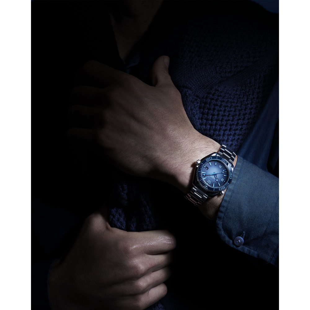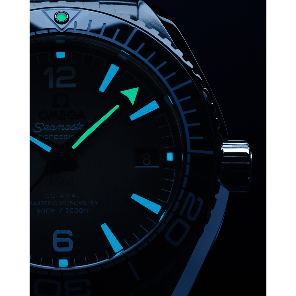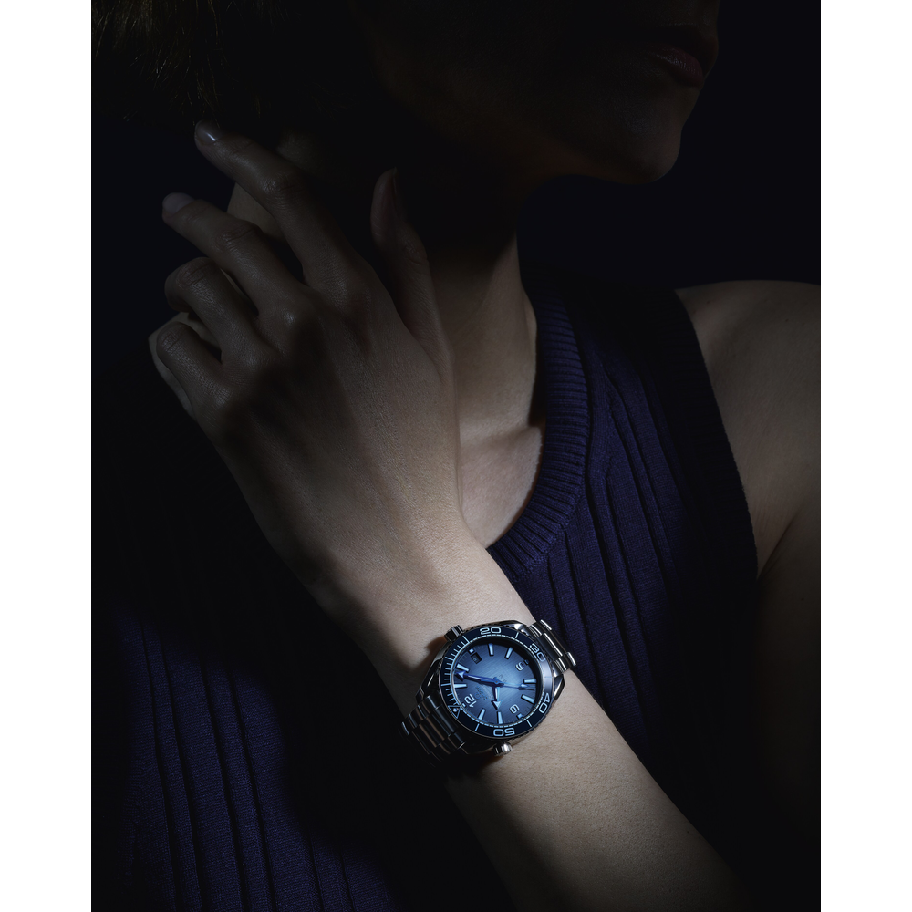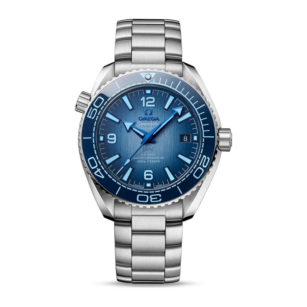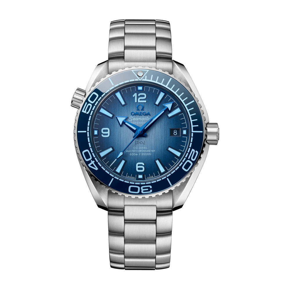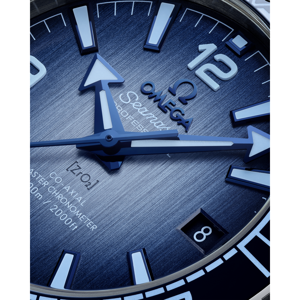 The vertical brushed ceramic dial in OMEGA’s own Summer Blue is PVD treated and varnished with a gradient finish to reflect the watch’s level of water resistance. A blue ceramic bezel with light blue diving scale encircles the bold display, which includes blued hands and indexes filled with a unique light blue Super-LumiNova.