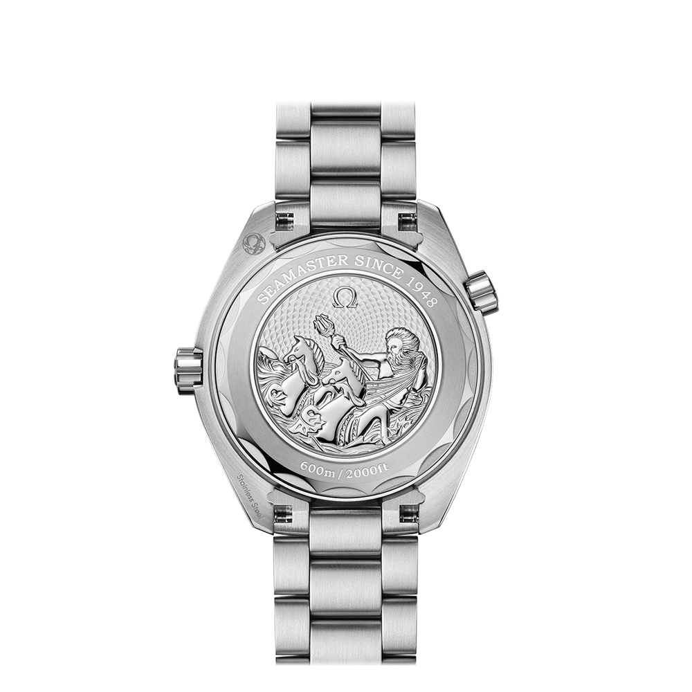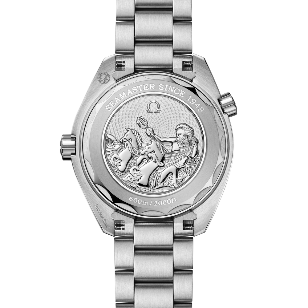 Turning the watch over reveals a stamped commemorative Seamaster logo depicting a trident-bearing Poseidon and two seahorses: OMEGA’s 1956 original and the brand’s current design. Behind which sits the OMEGA Co-Axial Master Chronometer calibre 8800.