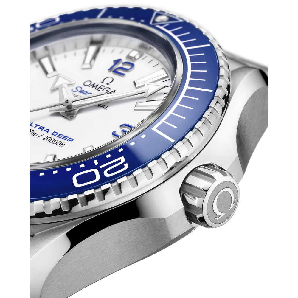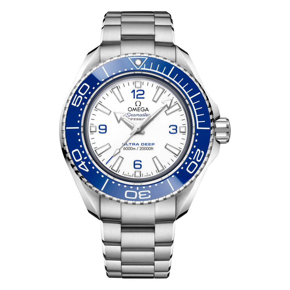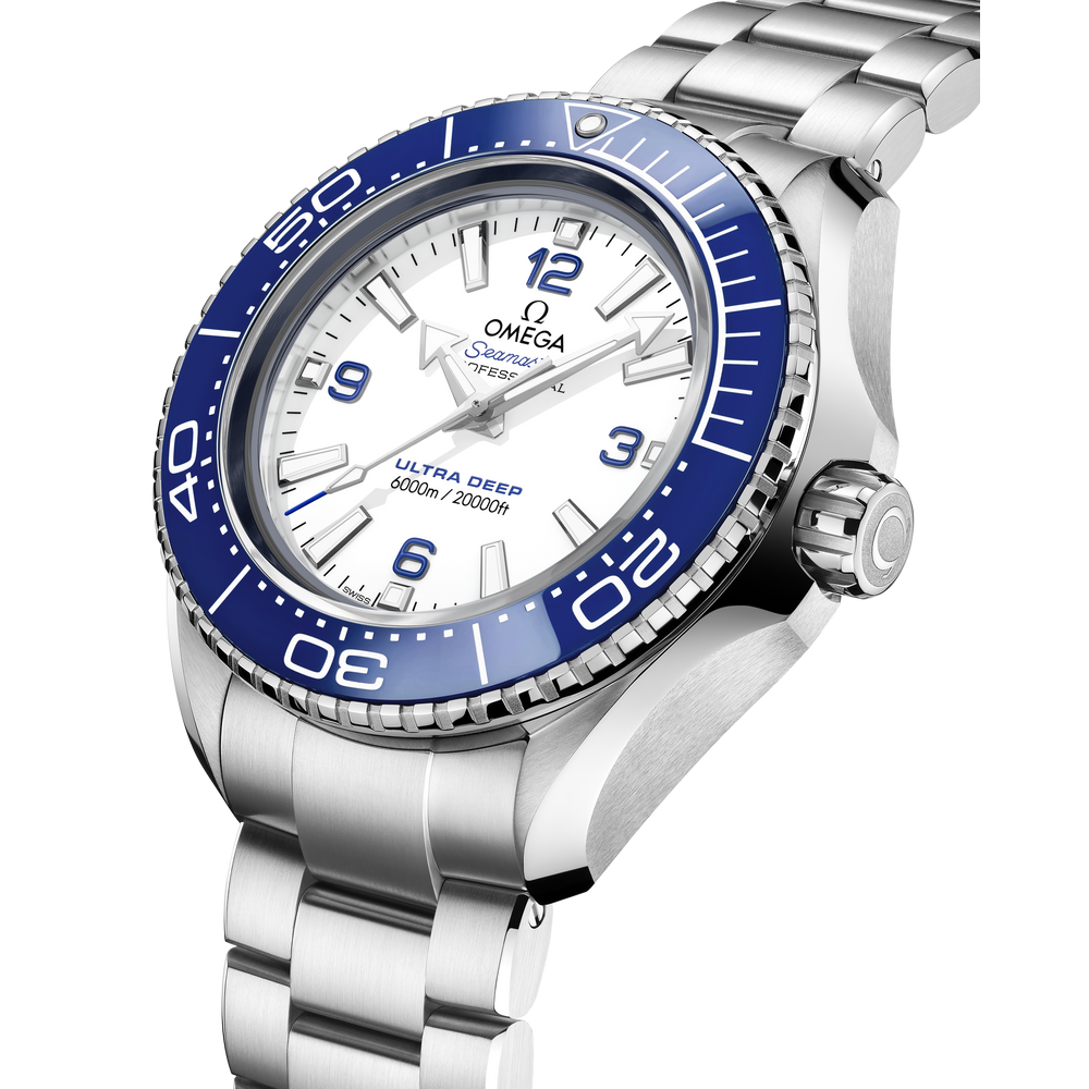 This 45.5 mm model in robust O-MEGASTEEL features a polished blue ceramic bezel with its diving scale in white enamel. Through the protuberant and domed sapphire crystal, the lacquered white dial has been given four Arabic numerals in blue, as well as 18K white gold hands and hour markers, which are all coated with white Super-LumiNova.