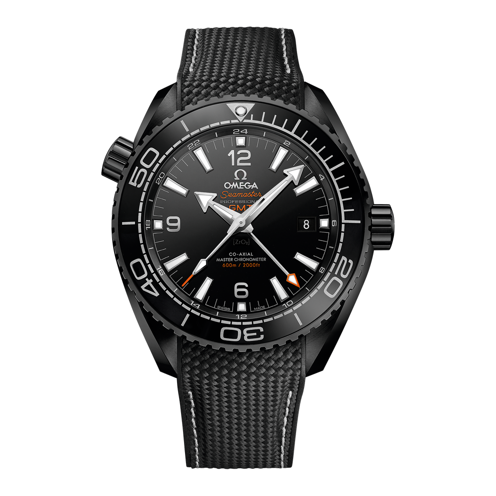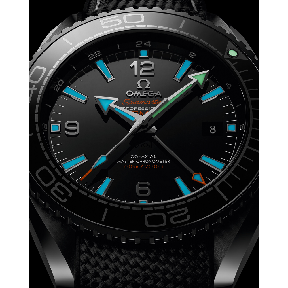 Exploring the dark side of the ocean, OMEGA has evolved its ceramic expertise to produce the Seamaster Planet Ocean “Deep Black”. This remarkable 45.5 mm timepiece is the combination of a GMT model and a diving watch. It is coloured totally black to represent the ocean at a depth of 300 m. The glossy and brushed casebody has been crafted from a single block of ceramic, the same material used for the unidirectional bezel and the dial with Arabic numerals.