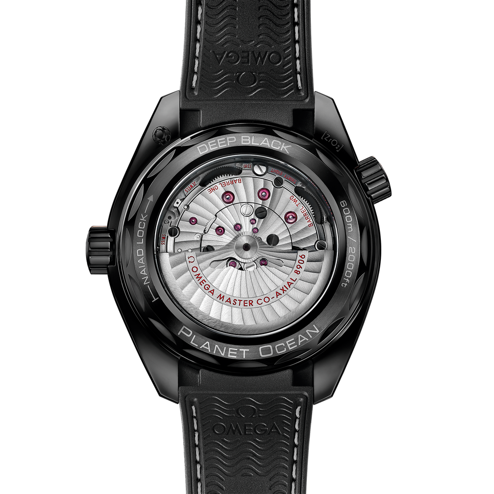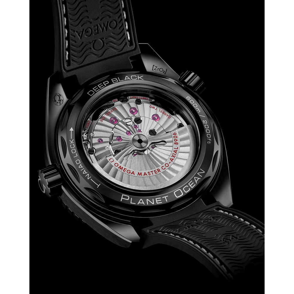 Other features include an alveol pattern on the screw-in caseback and a black rubber strap with contrasting stitching and an anti-bacterial treatment on the lining. The Planet Ocean “Deep Black” is water-resistant to 60 bar and is driven by the OMEGA Master Chronometer calibre 8906. To achieve Master Chronometer status, it has passed the 8 rigorous tests set by METAS (The Swiss Federal Institute of Metrology).