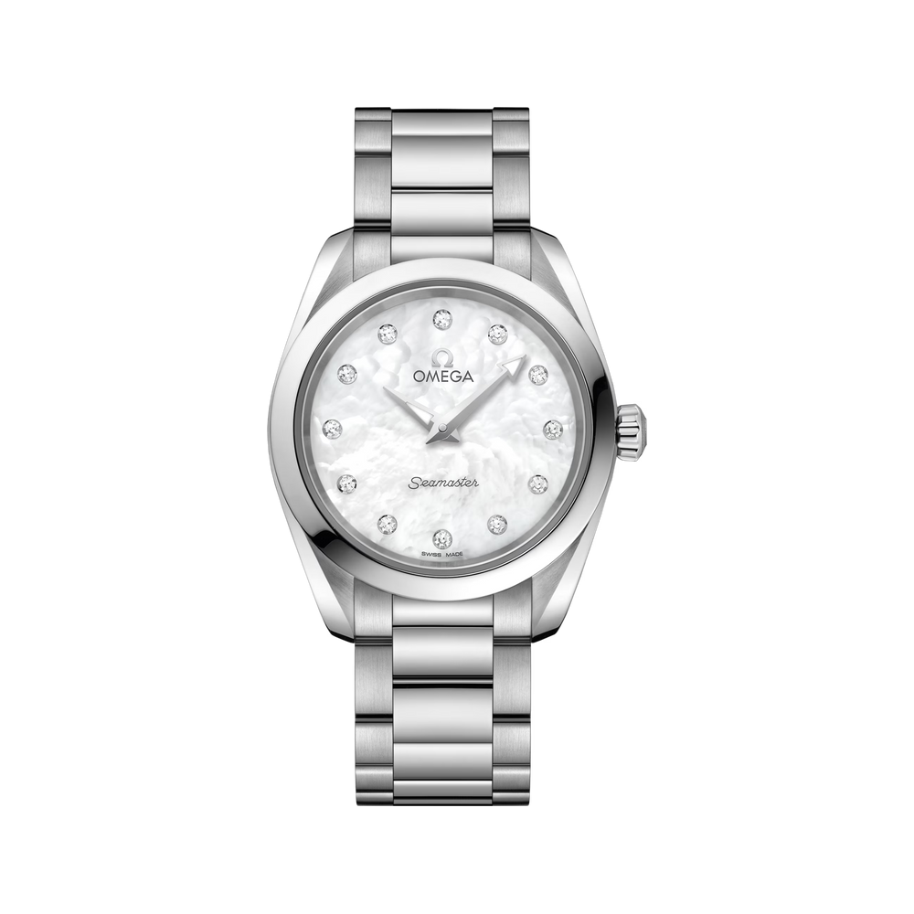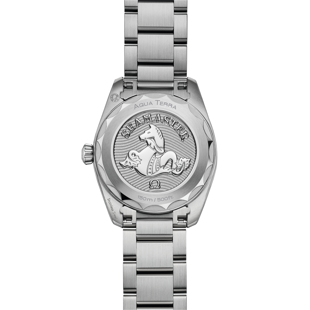 With a symmetrical 28 mm case, this stainless steel model features a white pearled mother-of-pearl dial and 12 diamond indexes in rhodium-plated holders. The hands are also rhodium-plated and the caseback is embossed with the OMEGA Seahorse on a wavy background.