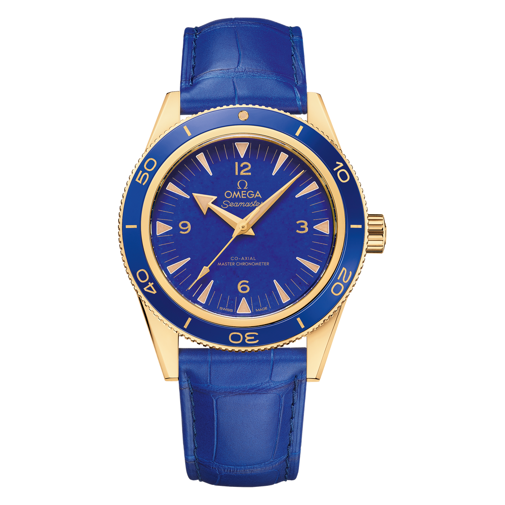 The 41 mm case has been made from 18K yellow gold and features a blue ceramic bezel with an OMEGA Ceragold™ diving scale. Most captivating of all is the watch’s deep blue dial, which is made from the precious stone lapis lazuli. It includes 18K yellow gold hands that are filled with “vintage” Super-LumiNova.