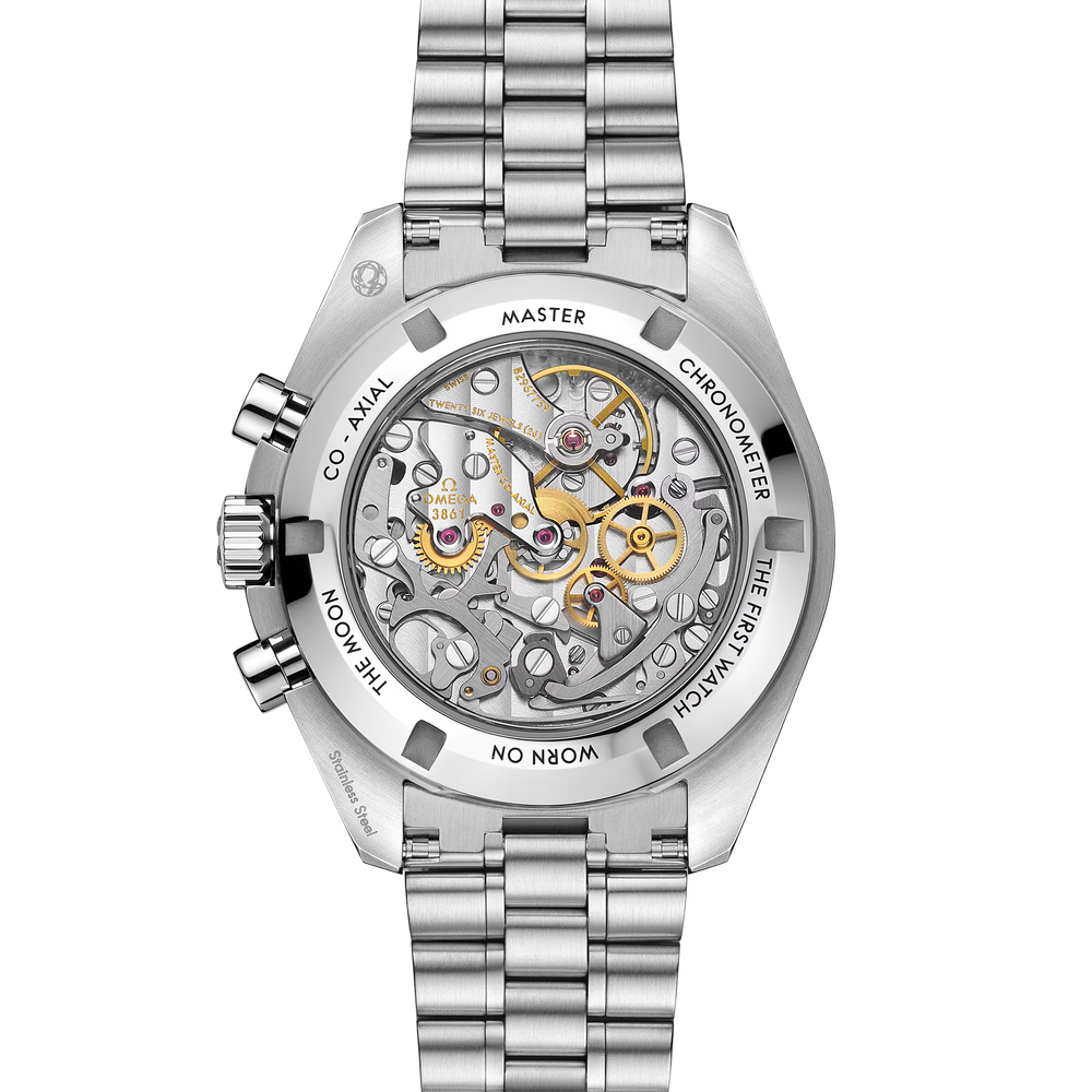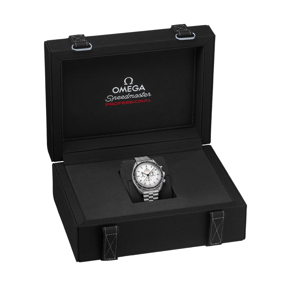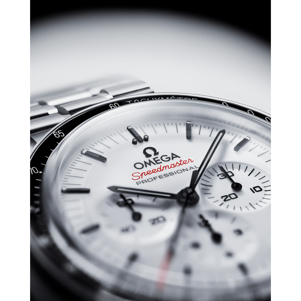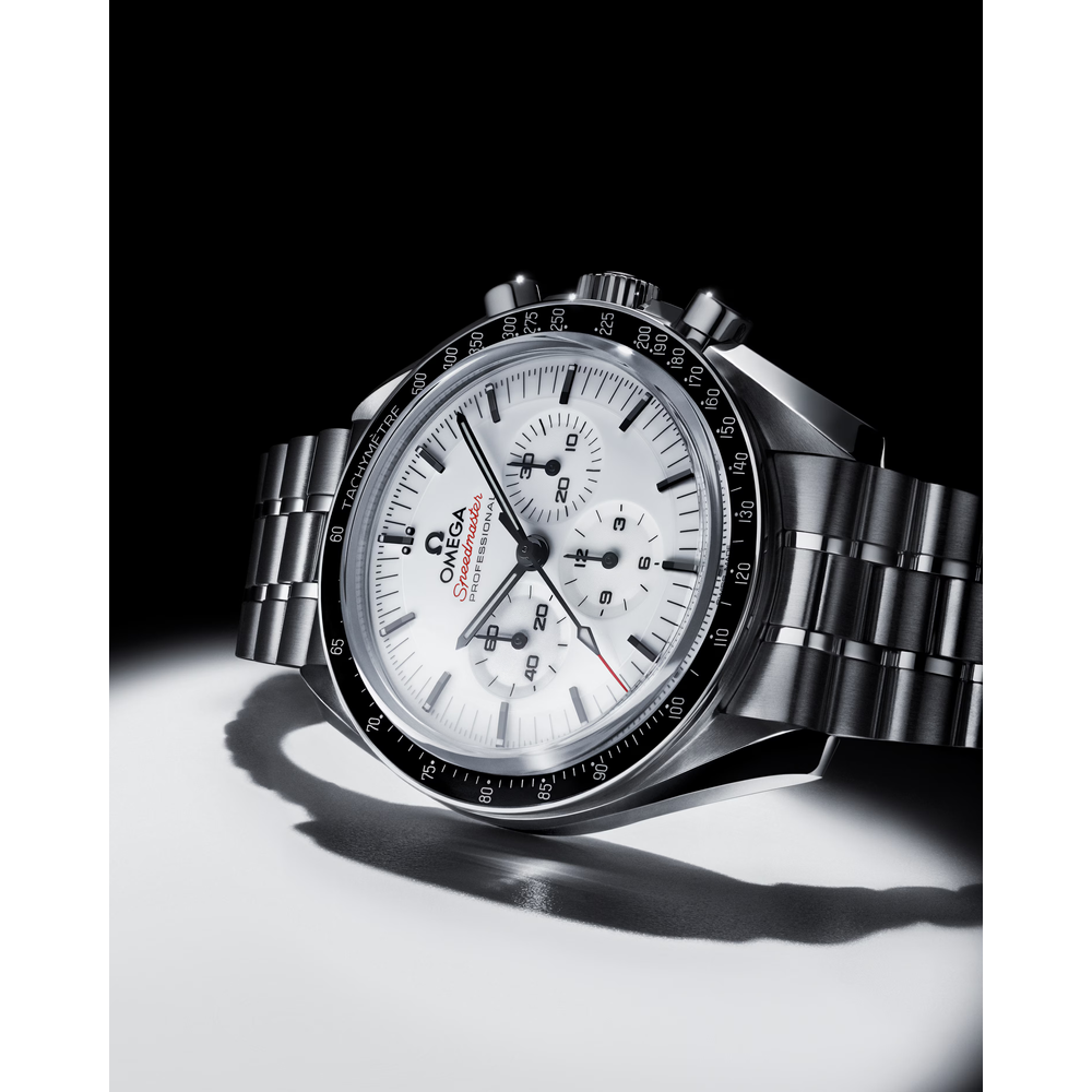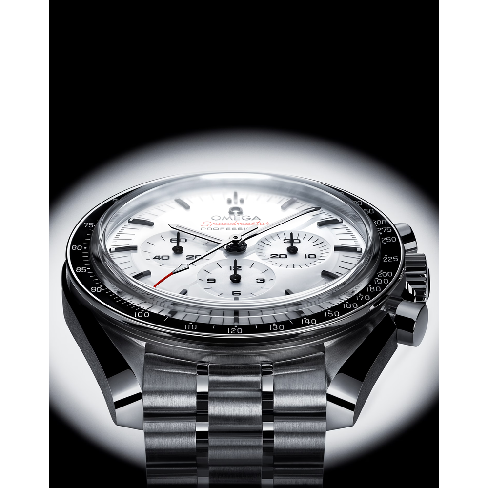 Presented on a polished-brushed bracelet, this 42 mm Moonwatch in stainless steel features sapphire crystal glass on the front as well as on the caseback. Inspired by the 4th generation Speedmaster style worn on the moon, it also includes an asymmetrical case, a white lacquered step dial with applied OMEGA logo and indexes, Moonwatch style hands, and the famous dot over 90 on the black anodised aluminium bezel ring.