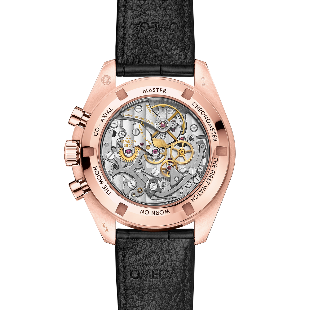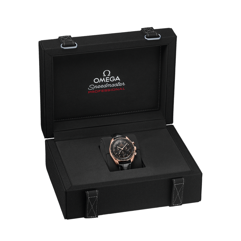 The Speedmaster Moonwatch is one of the world’s most iconic timepieces. Having been a part of all six moon landings, the legendary chronograph is an impressive representation of the brand’s adventurous pioneering spirit.Presented on a black leather strap, this 42 mm Moonwatch in 18K Sedna™ gold features sapphire crystal glass on the front as well as on the caseback. Inspired by the 4th generation Speedmaster style worn on the moon, it also includes an asymmetrical case, black step dial and the famous dot over 90 on the anodised aluminium bezel ring.The watch is driven by the OMEGA Co-Axial Master Chronometer Calibre 3861, which powers the small seconds sub-dial, 30-minute recorder and 12-hour recorder, along with the central chronograph function.