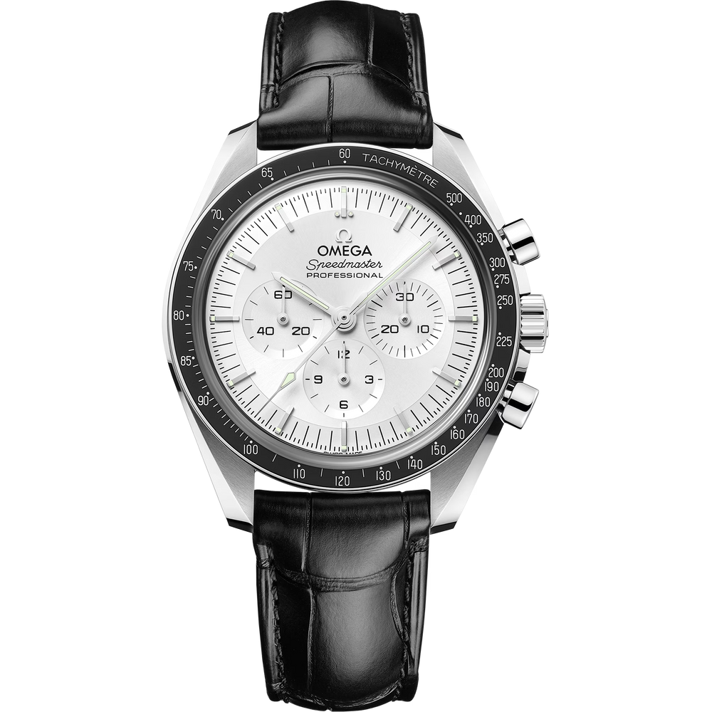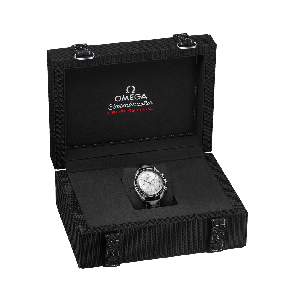 The Speedmaster Moonwatch is one of the world’s most iconic timepieces. Having been a part of all six moon landings, the legendary chronograph is an impressive representation of the brand’s adventurous pioneering spirit.Presented on a black leather strap, this 42 mm Moonwatch in 18K Canopus Gold™ features sapphire crystal glass on the front as well as on the caseback. Inspired by the 4th generation Speedmaster style worn on the moon, it also includes an asymmetrical case, sun-brushed silvery step dial and the famous dot over 90 on the anodised aluminium bezel ring.The watch is driven by the OMEGA Co-Axial Master Chronometer Calibre 3861, which powers the small seconds sub-dial, 30-minute recorder and 12-hour recorder, along with the central chronograph function.