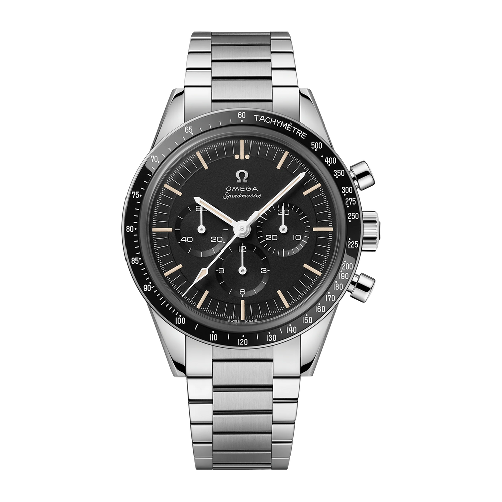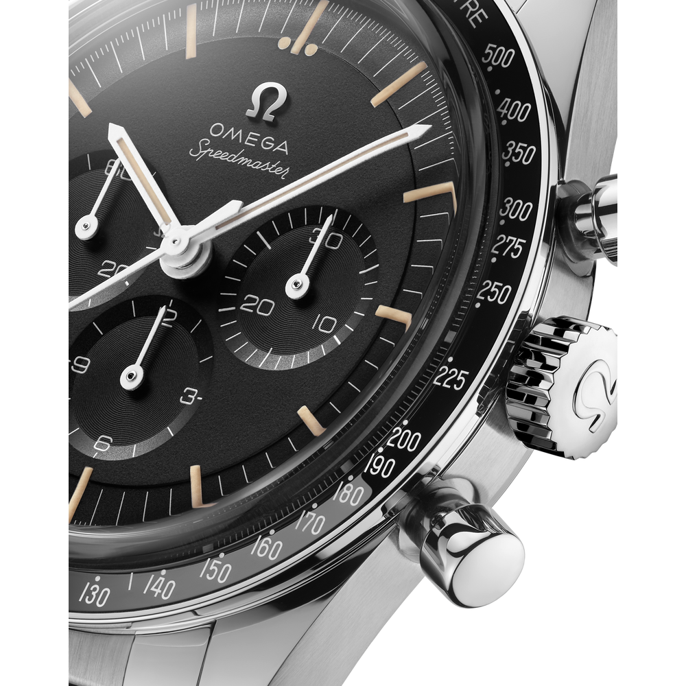 Having been a part of all six lunar missions, the legendary OMEGA Speedmaster is one of the world’s most iconic timepieces. This model has reprised the famous Calibre 321, which was an important part of the Speedmaster’s original space history.The 39.70 mm case is in stainless steel and is inspired by the same 3rd generation style worn during America’s first spacewalk in 1965. There is also a bezel ring in polished black ceramic [ZrO2] with the tachymeter scale in white enamel.The black step dial features familiar Moonwatch hands, a vintage OMEGA logo, as well as a small seconds sub-dial, 30-minute recorder and 12-hour recorder along with a central chronograph hand. Through the sapphire-crystal caseback, you can see the Calibre 321 inside.