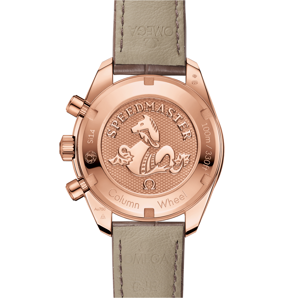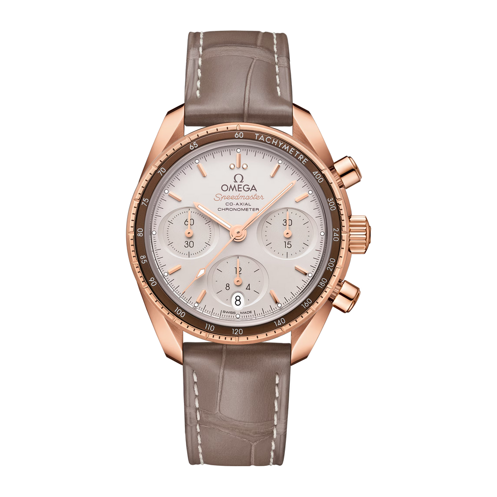The Speedmaster 38 mm collection has been crafted with simplicity, size and colour in mind, yet still retains the look and heritage of OMEGA’s most famous chronograph.This model features a full 18K Sedna™ gold case with a polished-brushed gold bezel which includes a tachymeter scale on a brown aluminium ring.The “cappuccino” dial includes horizontal brown oval subdials and a vertical oval date window at 6 o’clock. The indexes and hands are made of 18K Sedna™ gold with white Super-LumiNova on the hour, minute and chronograph seconds hands.The watch has a taupe-brown leather strap, a Seahorse medallion on the caseback, and is driven by the OMEGA Co-Axial Calibre 3330.