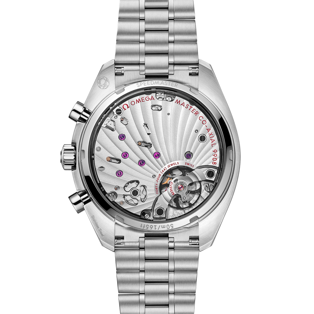 Presented on a stainless steel bracelet, the watch features a small-seconds counter at 9H, and a 60-minute and 12-hour recorder at 3H. Inside, the timepiece is driven by the OMEGA Co-Axial Master Chronometer Calibre 9908.