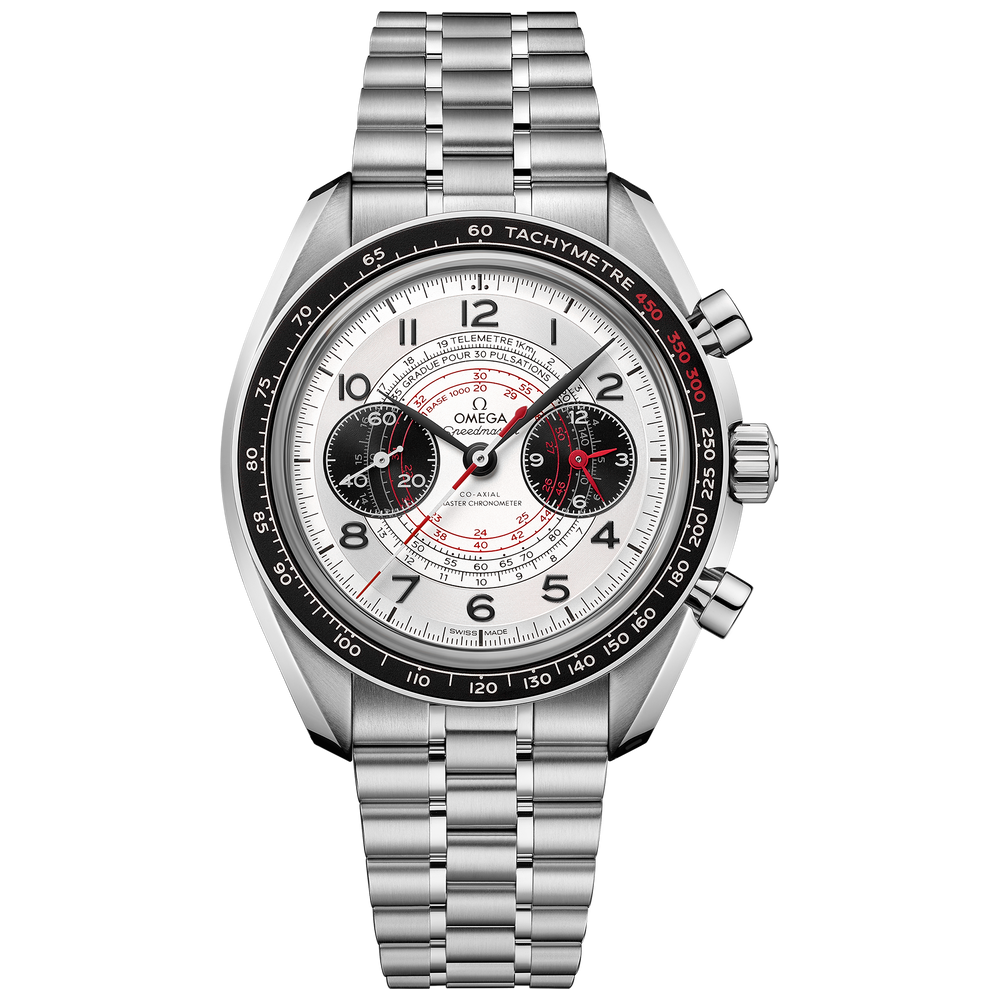 Presented on a stainless steel bracelet, the watch features a black small-seconds counter at 9H, and a black 60-minute and 12-hour recorder at 3H with red hands. Inside, the timepiece is driven by the OMEGA Co-Axial Master Chronometer Calibre 9908.